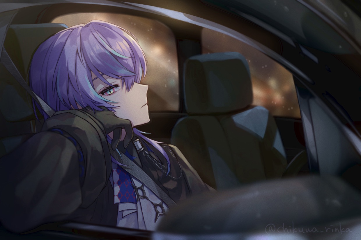 1boy :| aqua_eyes black_gloves black_shirt blue_hair blurry bokeh car chain chikuwa_(rinka) closed_mouth collared_shirt depth_of_field elbow_rest expressionless from_outside from_side gloves hair_between_eyes head_rest hoshirube_sho hoshirube_sho_(1st_costume) long_hair long_sleeves looking_at_viewer male_focus motor_vehicle multicolored_hair nijisanji profile purple_hair safety_belt shirt sideways_glance sitting solo streaked_hair twitter_username upper_body vest virtual_youtuber white_vest