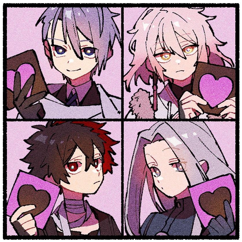 4boys bandaged_neck bandages blonde_hair blue_eyes blue_gloves blue_hair border brown_hair card character_request closed_mouth earrings gloves grey_background grey_eyes grey_hair heart himetsuru_ichimonji_(touken_ranbu) hizen_tadahiro holding holding_card japanese_clothes jewelry kimono long_hair looking_at_viewer male_focus multicolored_hair multiple_boys nploser red_eyes simple_background split-color_hair touken_ranbu very_long_hair white_border white_kimono yellow_eyes