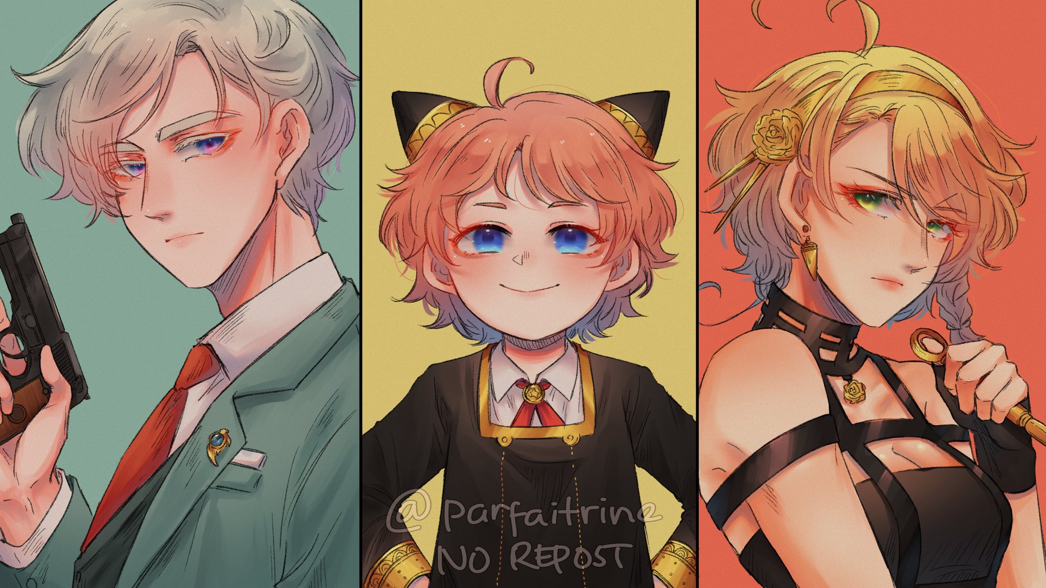 1boy 2girls anya_(spy_x_family) anya_(spy_x_family)_(cosplay) black_dress blue_eyes blush closed_mouth cosplay dress earrings eden_academy_school_uniform emma_(yakusoku_no_neverland) formal_clothes green_eyes green_jacket green_suit grey_hair gun hairpods handgun highres holding holding_gun holding_weapon jacket jewelry long_sleeves multiple_girls necktie norman_(yakusoku_no_neverland) orange_hair original parfaitrine red_necktie school_uniform short_hair spy_x_family suit twilight_(spy_x_family) twilight_(spy_x_family)_(cosplay) weapon yakusoku_no_neverland yor_briar yor_briar_(cosplay)