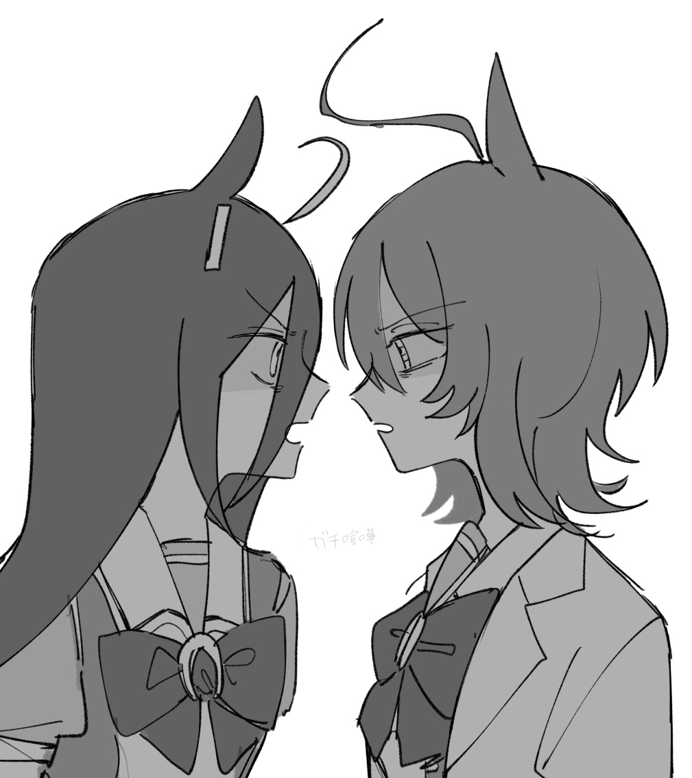 2girls agnes_tachyon_(umamusume) ahoge angry animal_ears arguing bags_under_eyes bow bowtie coat collared_coat ear_tag earrings greyscale hair_between_eyes horse_ears horse_girl huge_ahoge jewelry lab_coat long_bangs long_hair long_hair_between_eyes long_sleeves manhattan_cafe_(umamusume) medium_hair monochrome multiple_girls open_clothes open_coat open_mouth puffy_short_sleeves puffy_sleeves saezurippp sailor_collar sailor_shirt school_uniform scowl shaded_face shirt short_sleeves simple_background single_earring tracen_school_uniform umamusume white_background wolf_cut