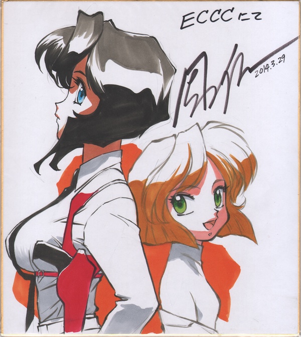 2girls :d artist_name back-to-back belt black_hair black_necktie blonde_hair blue_eyes blunt_ends bob_cut breasts closed_mouth collared_shirt dated dress_shirt expressionless eyelashes from_side green_eyes gun gunsmith_cats handgun hands_on_own_hips height_difference holster holstered inverted_bob jacket looking_at_viewer looking_to_the_side marker_(medium) medium_breasts minnie_may_hopkins multiple_girls necktie off_shoulder official_art open_mouth orange_background pants rally_vincent scan shikishi shirt short_hair shoulder_holster sidelocks signature small_breasts smile sonoda_ken'ichi standing swept_bangs traditional_media two-tone_background upper_body weapon white_background white_belt white_jacket white_pants white_shirt