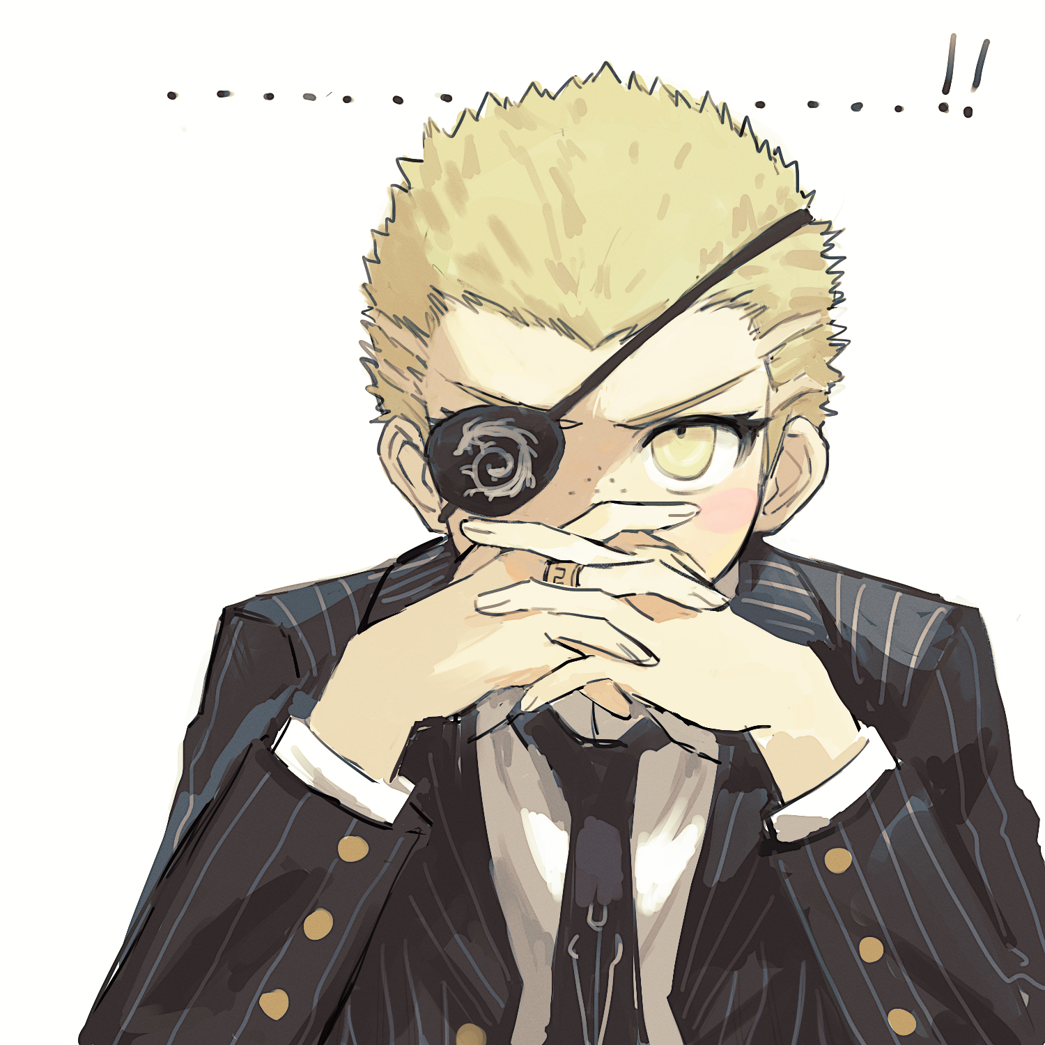 ! !! ... 1boy black_jacket black_necktie blonde_hair casssstle12 danganronpa_(series) danganronpa_2:_goodbye_despair eyepatch freckles hands_up highres interlocked_fingers jacket jewelry kuzuryu_fuyuhiko long_sleeves male_focus necktie ring short_hair solo striped_clothes striped_jacket white_background yellow_eyes