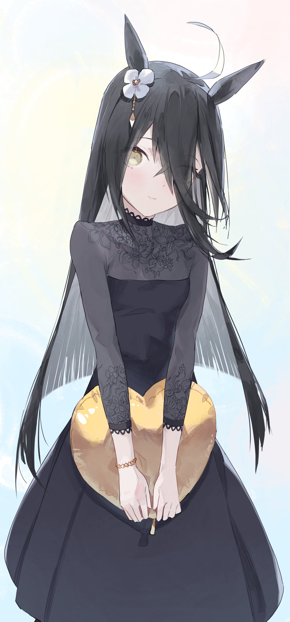 1girl ahoge amano_kokoko animal_ears balloon black_dress black_hair bracelet china_dress chinese_clothes dress ear_flower ear_ornament eyes_visible_through_hair frilled_sleeves frills fur_collar hair_between_eyes hair_over_one_eye heart_balloon highres holding holding_balloon homare_(g_hmr88) horse_ears jewelry lace lace-trimmed_sleeves lace_dress lace_sleeves lace_trim long_bangs long_dress long_hair long_hair_between_eyes looking_at_viewer manhattan_cafe_(umamusume) multicolored_hair see-through_clothes see-through_dress simple_background smile solo standing straight_hair umamusume very_long_hair white_background yellow_eyes