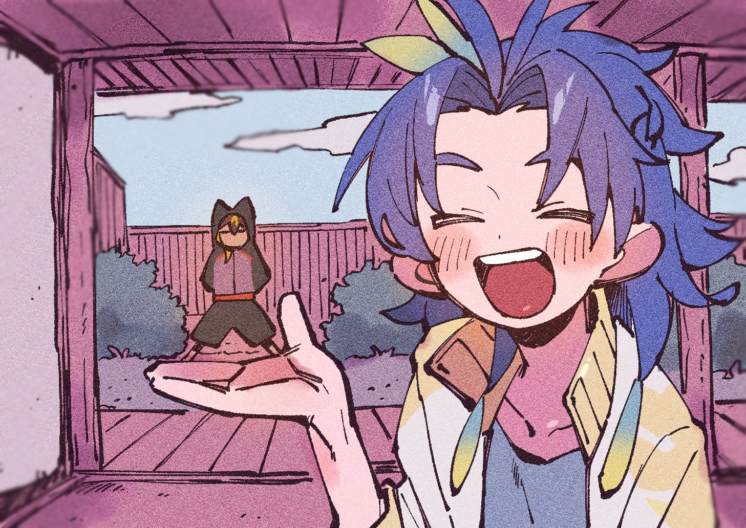 2boys animal_hood antenna_hair black_jacket black_pants blue_hair blue_shirt blush bush cat_hood closed_eyes fence high_ponytail hood hooded_jacket jacket kashagiri_(touken_ranbu) long_hair long_sleeves multiple_boys nploser open_mouth pants parted_bangs ponytail porch shirt smile taikogane_sadamune touken_ranbu yellow_jacket