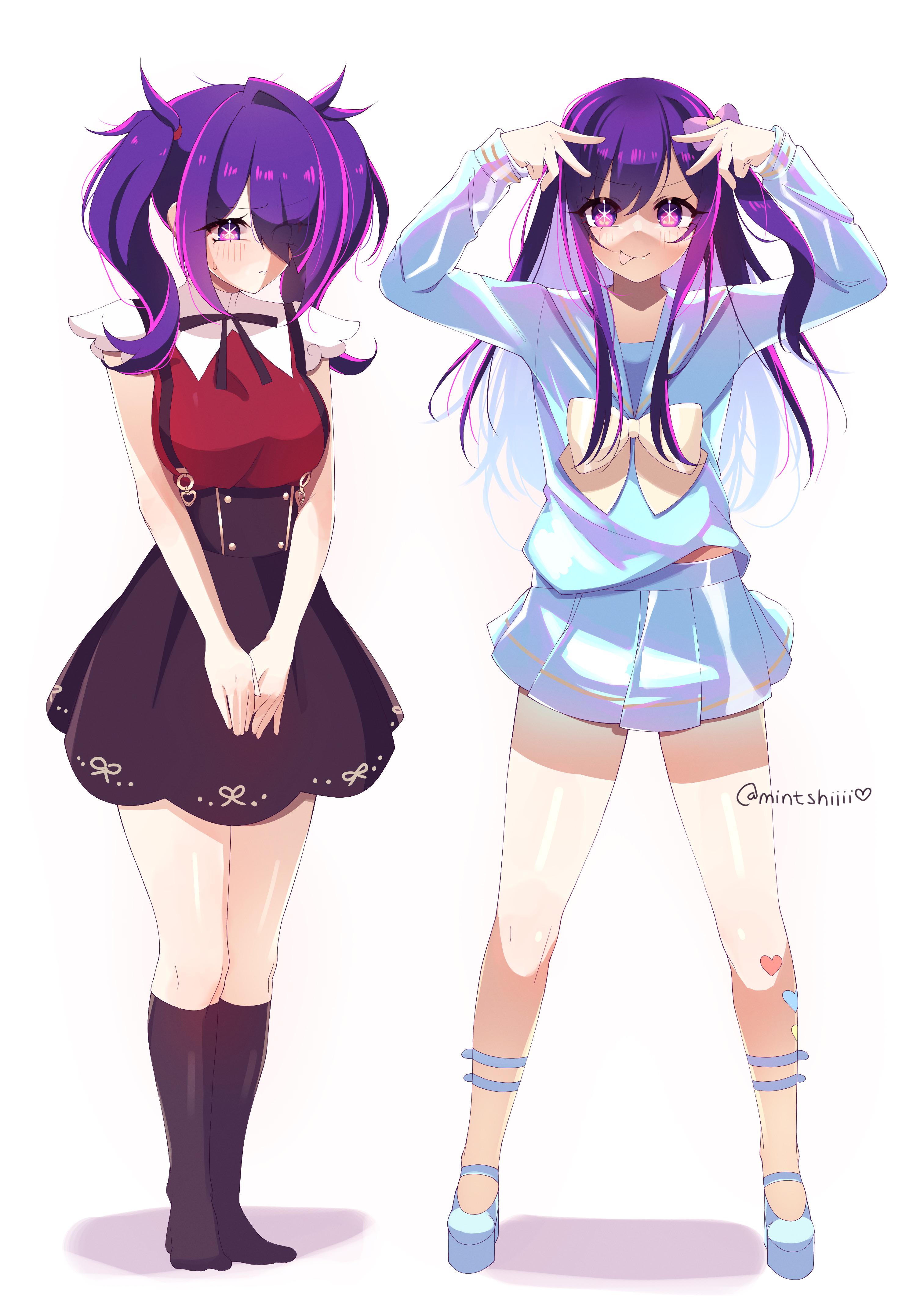 1girl :p absurdres ame-chan_(needy_girl_overdose) ame-chan_(needy_girl_overdose)_(cosplay) black_ribbon blue_footwear blue_serafuku blue_shirt blue_skirt bow breasts chouzetsusaikawa_tenshi-chan chouzetsusaikawa_tenshi-chan_(cosplay) collared_shirt commentary commission cosplay double_v english_commentary full_body hair_bow hair_over_one_eye highres hoshino_ai hoshino_ai's_pose kneehighs large_breasts legs_apart long_hair long_sleeves looking_at_viewer looking_down mintshiiii neck_ribbon needy_girl_overdose no_shoes one_side_up oshi_no_ko own_hands_together pleated_skirt purple_eyes purple_hair red_shirt ribbon school_uniform serafuku shirt shoes shy sidelocks skirt smile socks standing star-shaped_pupils star_(symbol) suspender_skirt suspenders symbol-shaped_pupils tongue tongue_out twintails v v_over_eye white_background yellow_bow