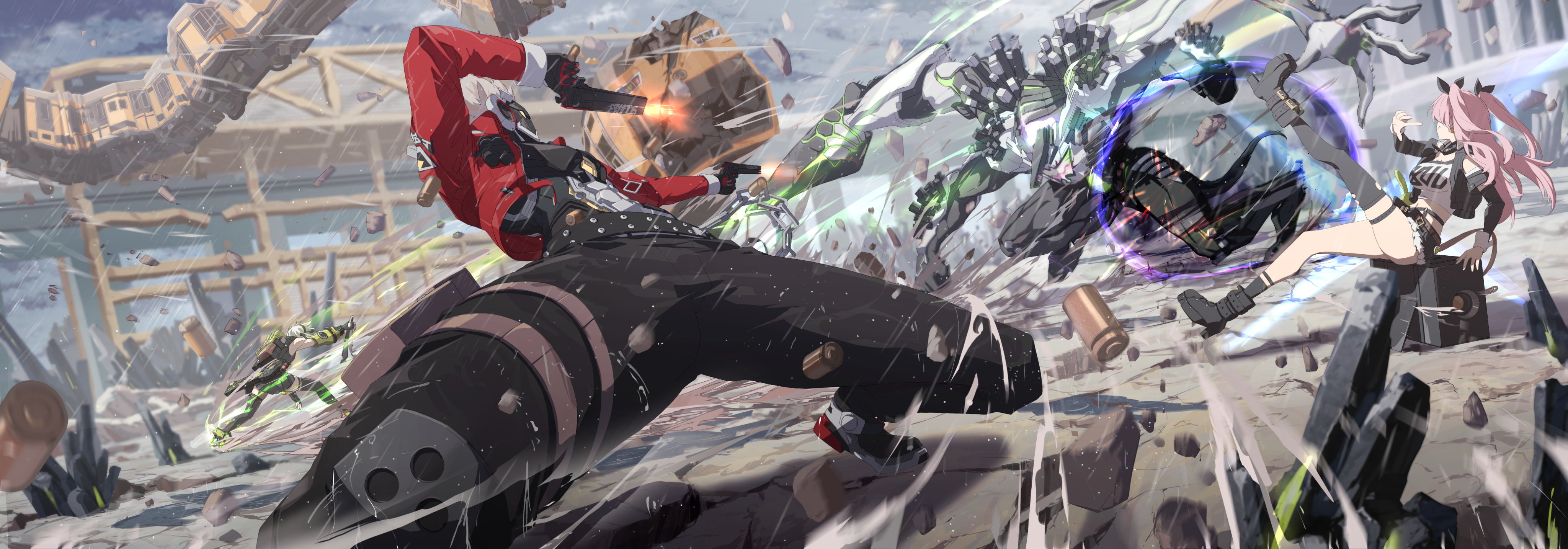 1boy 2girls absurdres anby_demara arms_up asymmetrical_legwear battle billy_kid boots casing_ejection day debris detached_sleeves energy_ball ethereal_(zenless_zone_zero) firing fisheye foreshortening grey_hair gun handgun highres holding holding_gun holding_weapon humanoid_robot jacket leg_up long_hair long_sleeves looking_at_another momiji_oroshi monster multiple_girls muzzle_flash nicole_demara outdoors outstretched_arm outstretched_legs pants pink_hair red_jacket robot shell_casing shirt shorts single_thighhigh sitting skirt squatting thighhighs twintails weapon wind zenless_zone_zero