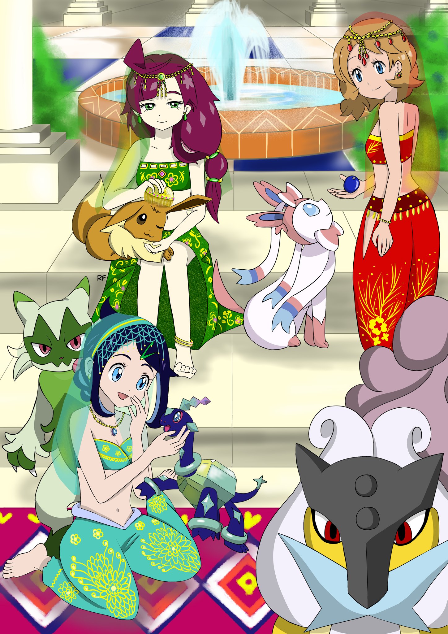 berry_(pokemon) blue_eyes blue_hair bow brown_hair chloe_(pokemon) dancer eevee floragato gen_1_pokemon gen_2_pokemon gen_6_pokemon green_eyes hair_ornament highres holding legendary_pokemon liko_(pokemon) long_hair navel nintendo oran_berry pink_eyes pokemon pokemon_(anime) pokemon_(creature) pokemon_horizons pokemon_journeys pokemon_the_series:_xy purple_hair raikou red_eyes ribbon serena_(pokemon) sylveon terapagos terapagos_(normal)