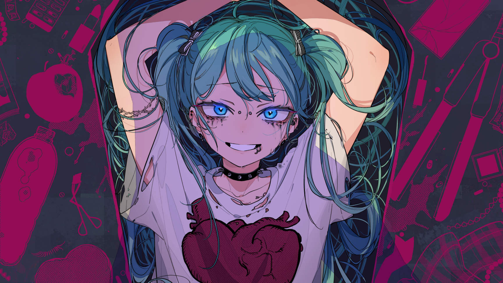 1girl arms_up black_choker blue_eyes choker commentary_request ear_piercing green_hair grin hassan_(sink916) hatsune_miku highres long_hair looking_at_viewer makeup official_art piercing runny_makeup sad_girl_sex_(vocaloid) shirt short_sleeves smile solo spiked_choker spikes twintails upper_body vocaloid white_shirt