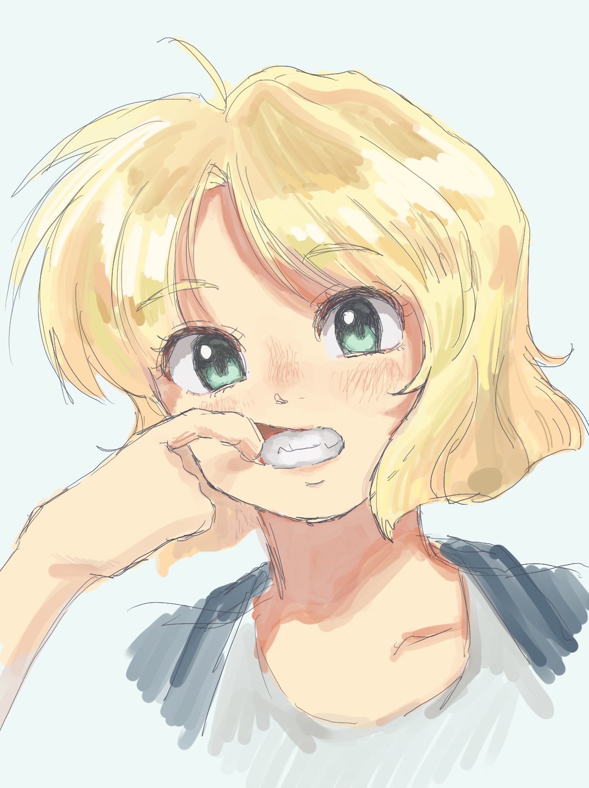 1girl ahoge blonde_hair blue_jacket blunt_ends blush bob_cut close-up collarbone commentary cropped_torso eyelashes finger_in_own_mouth green_eyes grey_background grin gunsmith_cats highres jacket looking_at_viewer minnie_may_hopkins nose_blush nutampo parted_bangs portrait shirt short_hair simple_background sketch smile solo teasing teeth wavy_hair white_background white_shirt