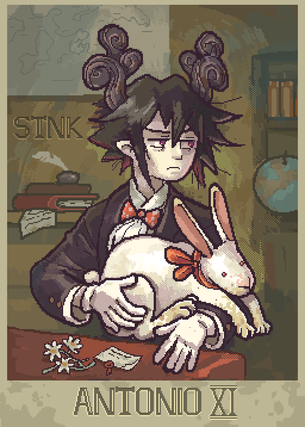 1boy animal black_hair book bookshelf colored_skin daisy_(flower) demon_boy demon_horns fake_photograph flower funamusea globe highres holding holding_animal holding_rabbit horns letter male_focus map_(object) multicolored_hair pixel_art purple_eyes quill rabbit red_hair satanick_(funamusea) solo table two-tone_hair white_skin woooh