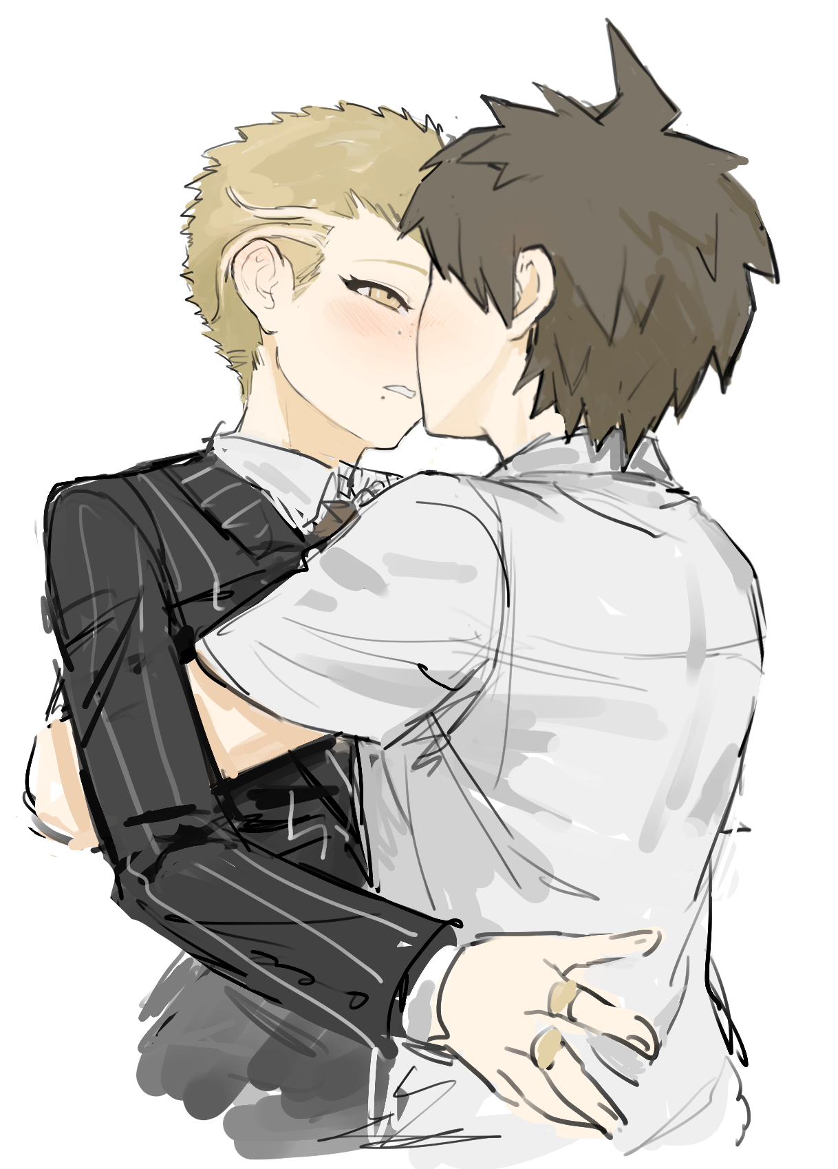 2boys ahoge black_jacket blonde_hair blush brown_hair casssstle12 cropped_torso danganronpa_(series) danganronpa_2:_goodbye_despair eye_contact grey_background half-closed_eyes highres hinata_hajime jacket jewelry kuzuryu_fuyuhiko long_sleeves looking_at_another male_focus multiple_boys ring short_hair short_sleeves simple_background striped_clothes striped_jacket teeth yellow_eyes