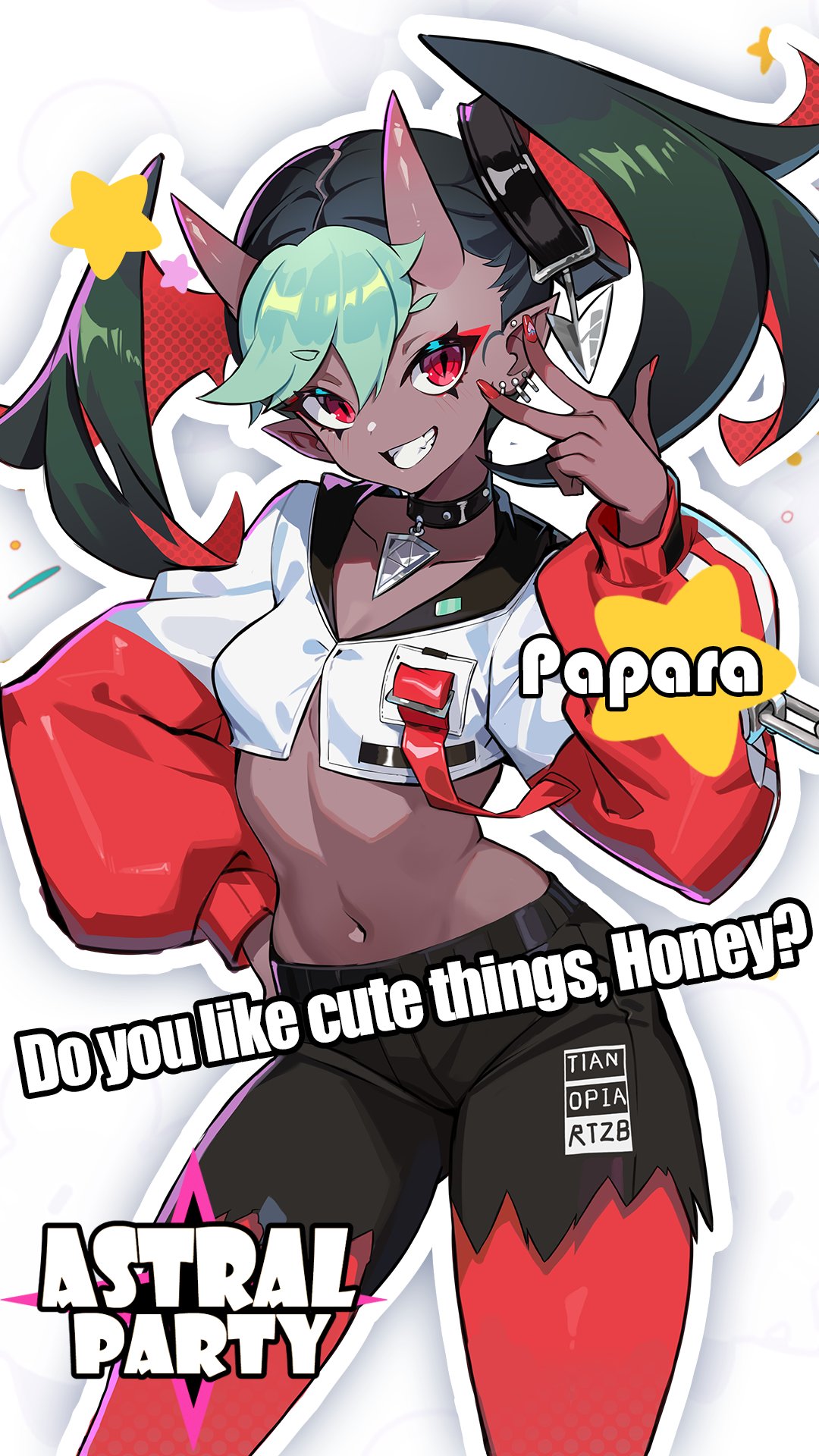 1girl astral_party collar colored_inner_hair dark_skin demon_girl demon_horns earrings english_text green_hair grin highres horns jacket jewelry long_sleeves midriff multicolored_hair nail_polish official_art pants papara pointy_ears puffy_long_sleeves puffy_sleeves red_eyes simao_(x_x36131422) smile swept_bangs symbol-shaped_pupils torn_clothes torn_pants twintails v