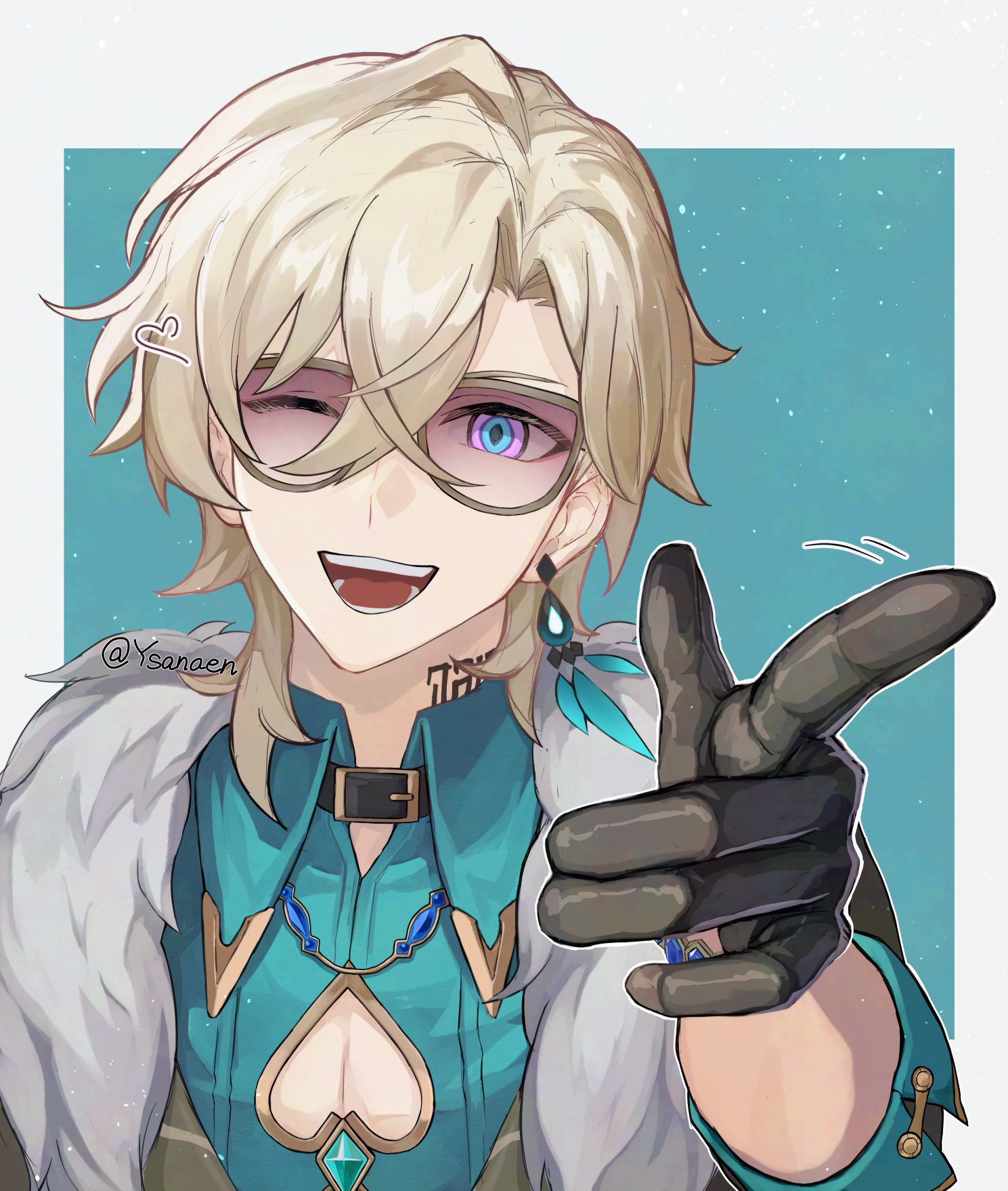1boy aventurine_(honkai:_star_rail) black_collar black_gloves black_jacket blonde_hair blue_eyes blue_shirt bracelet clothing_cutout collar collared_shirt earrings fur-trimmed_jacket fur_trim glasses gloves hair_between_eyes half_gloves highres honkai:_star_rail honkai_(series) index_finger_raised jacket jewelry looking_at_viewer male_focus multicolored_eyes neck_tattoo one_eye_closed open_mouth pink_eyes pointing pointing_at_viewer shirt short_hair single_earring smile solo spade_cutout tattoo teeth twitter_username two-tone_eyes upper_body ysanaen
