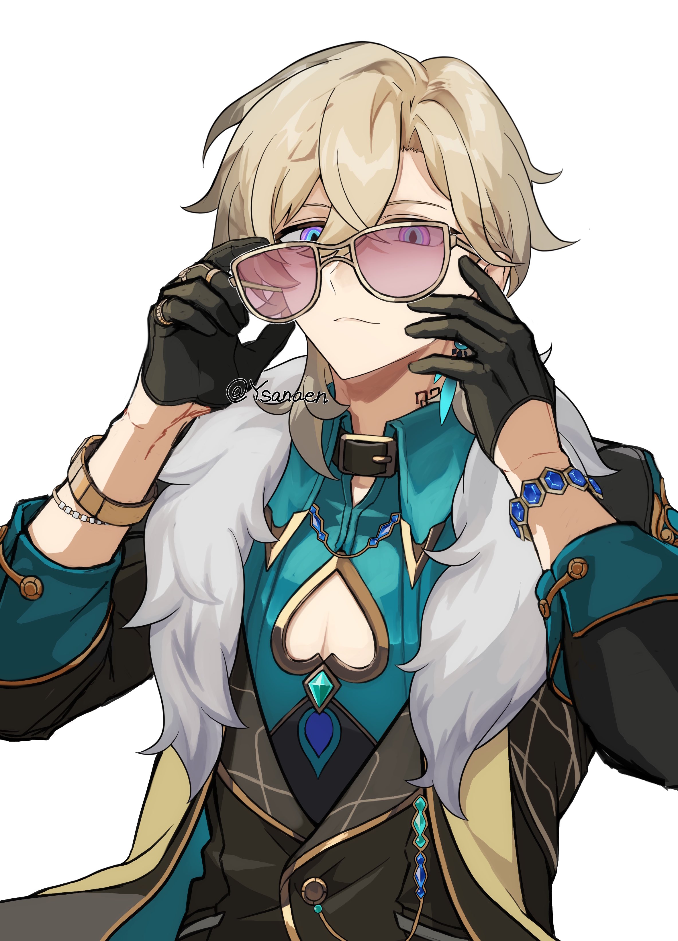 1boy 1girl absurdres aventurine_(honkai:_star_rail) black_collar black_gloves black_jacket blonde_hair blue_eyes blue_shirt bracelet clothing_cutout collar collared_shirt earrings fur-trimmed_jacket fur_trim gloves hair_between_eyes half_gloves highres holding holding_removed_eyewear honkai:_star_rail honkai_(series) jacket jewelry long_sleeves male_focus multicolored_eyes neck_tattoo pink_eyes shirt short_hair simple_background single_earring solo spade_cutout tattoo twitter_username two-tone_eyes unworn_eyewear upper_body watch white_background wristwatch yellow-framed_eyewear ysanaen