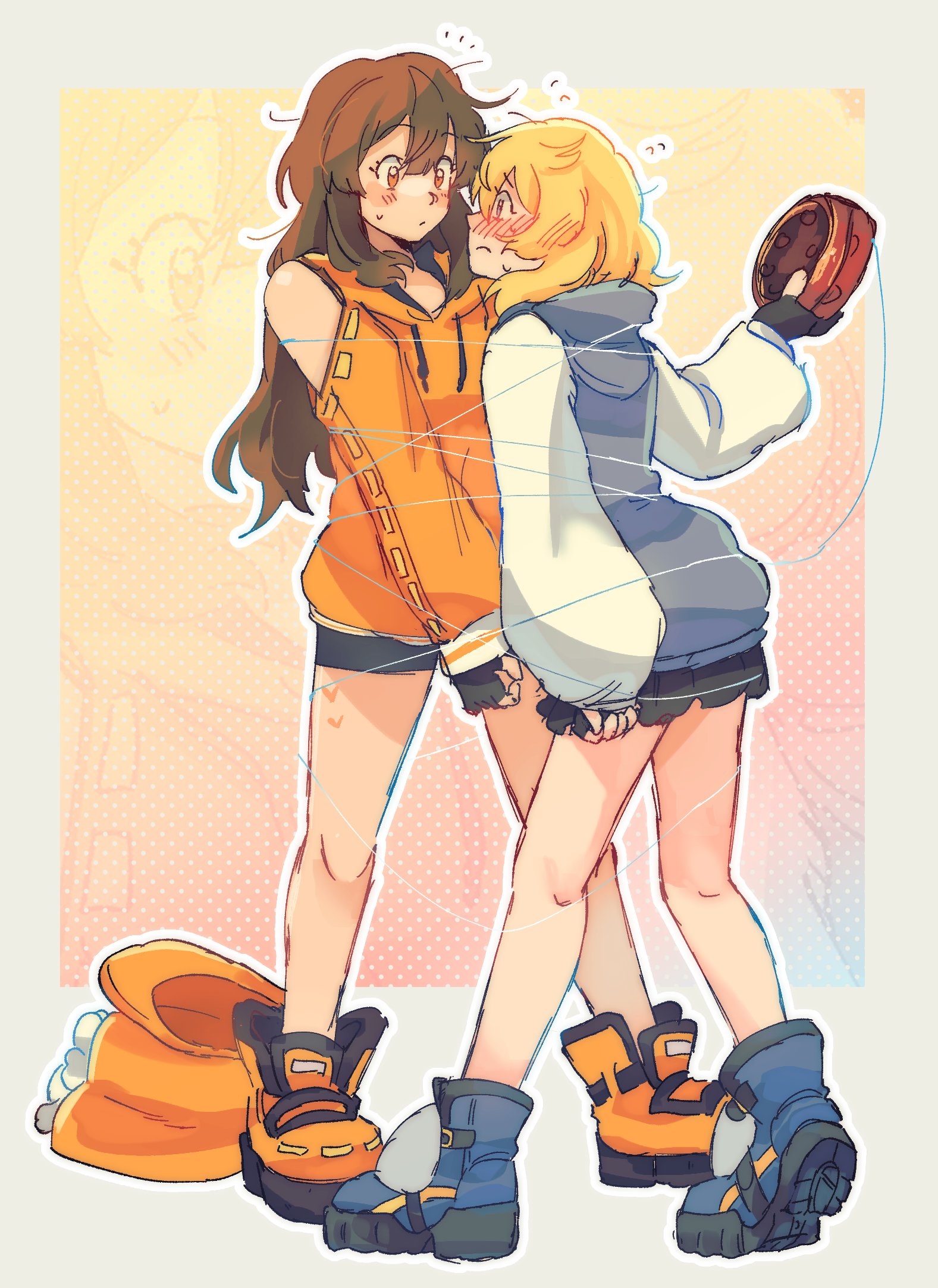 1boy 1girl armpit_cutout black_gloves black_shorts blonde_hair blue_eyes blue_footwear blue_hoodie blush boots bound bridget_(guilty_gear) brown_eyes brown_hair clothing_cutout commentary english_commentary fingerless_gloves gloves guilty_gear hat hetero highres hood hood_down hoodie kira_(marshukitty) long_hair may_(guilty_gear) medium_hair miniskirt orange_boots orange_hat orange_hoodie peaked_cap shorts skirt tied_up_(nonsexual) trap white_sleeves yo-yo