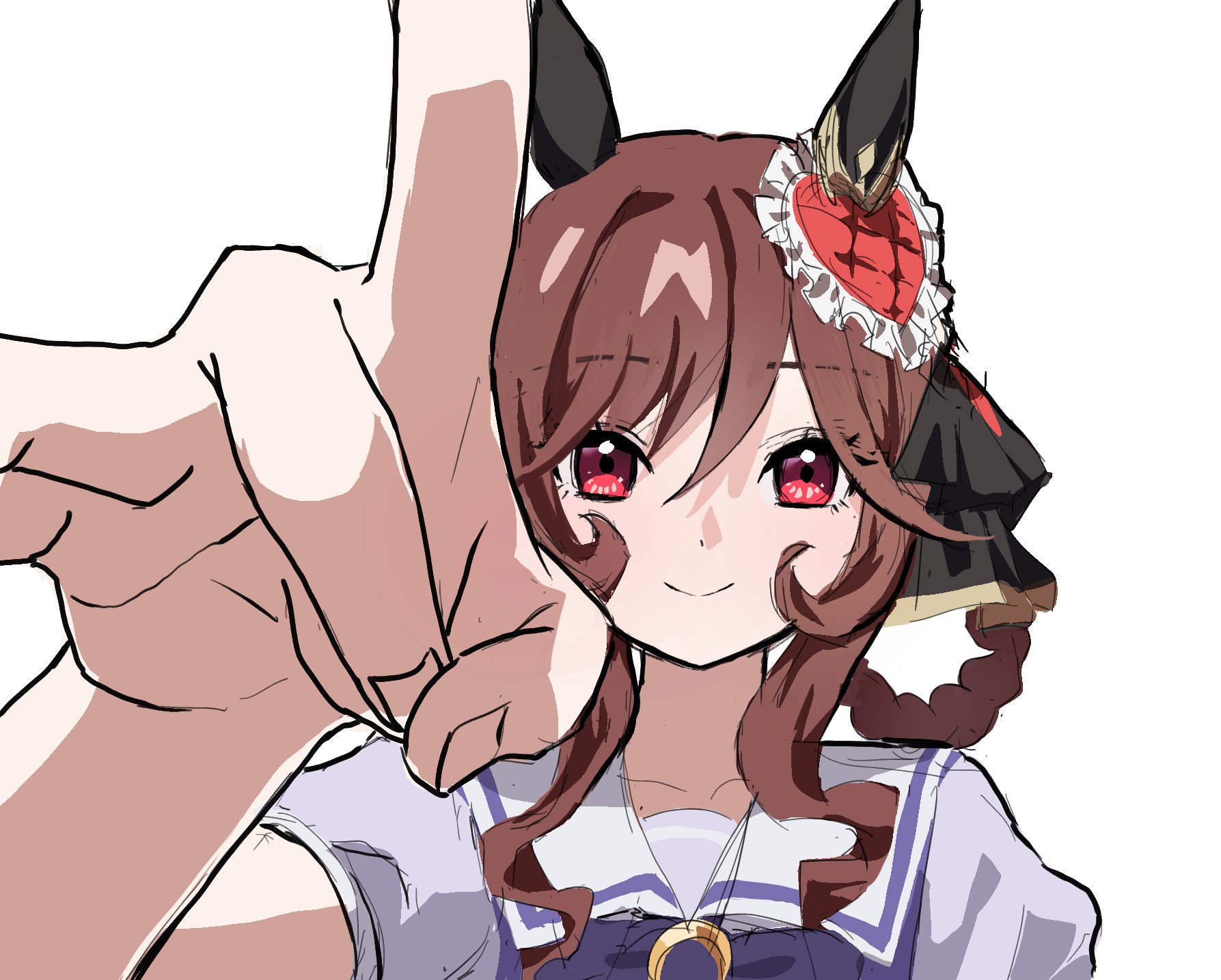 1girl animal_ears blush braid braided_hair_rings breasts brown_hair commentary_request gentildonna_(umamusume) hair_ornament hair_rings highres horse_ears horse_girl impending_doom looking_at_viewer meme pililia_chanjk portrait pov red_eyes school_uniform smile solo umamusume white_background
