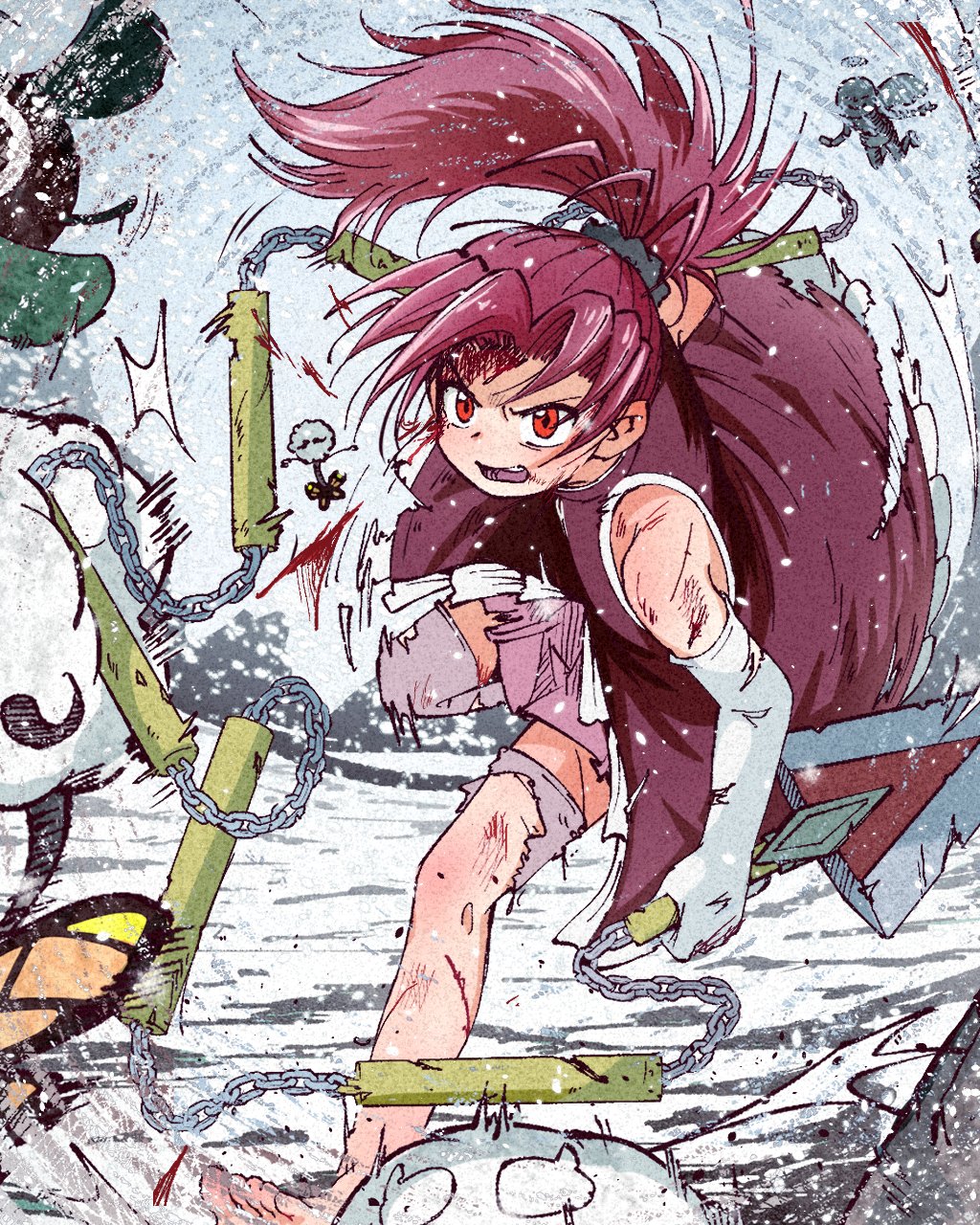 1girl anthony_(madoka_magica) attack bare_shoulders barefoot blood chain curtained_hair cuts dress elbow_gloves familiar_(madoka_magica) floating_clothes gloves hair_ornament hair_scrunchie highres injury leg_up long_hair magical_girl mahou_shoujo_madoka_magica nunchaku okai_(pixiv6333) ponytail red_dress red_eyes red_hair sakura_kyoko sakura_kyoko_(magical_girl) scrunchie serious sleeveless sleeveless_dress snow snowing solo_focus standing thighhighs torn_clothes torn_thighhighs weapon