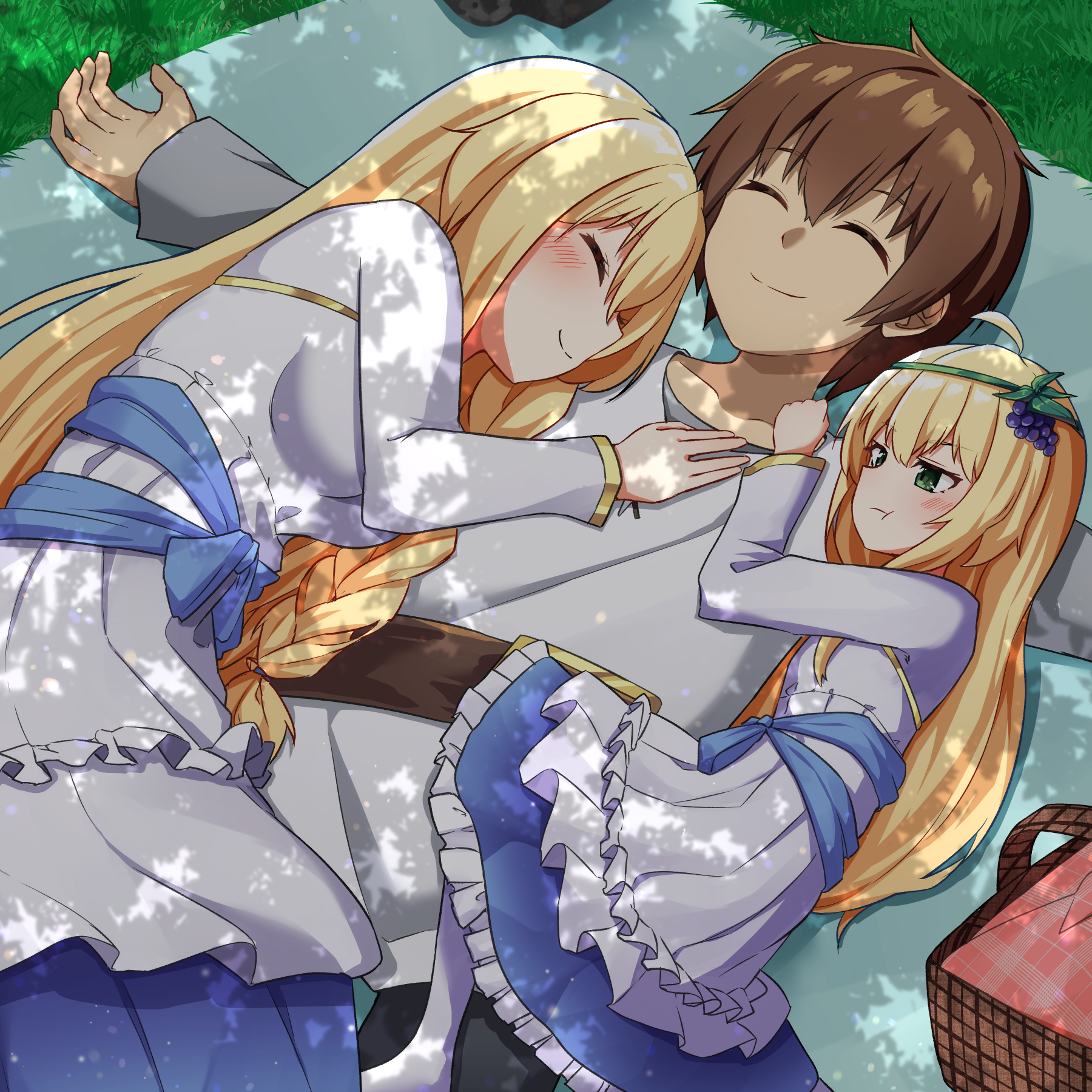 1boy 2girls :t aged_up blonde_hair blue_bow blue_skirt blush bow braid breasts brown_hair closed_eyes closed_mouth commentary_request commission day dress family father_and_child father_and_daughter frilled_dress frilled_skirt frills grass green_eyes grey_shirt hair_between_eyes highres husband_and_wife if_they_mated iris_(konosuba) kono_subarashii_sekai_ni_shukufuku_wo! long_hair long_sleeves lying medium_breasts mother_and_child mother_and_daughter multiple_girls nenosame on_back on_side outdoors outstretched_arms pantyhose parent_and_child picnic_basket picnic_blanket pout satou_kazuma shirt skeb_commission skirt smile spread_arms very_long_hair white_dress white_pantyhose