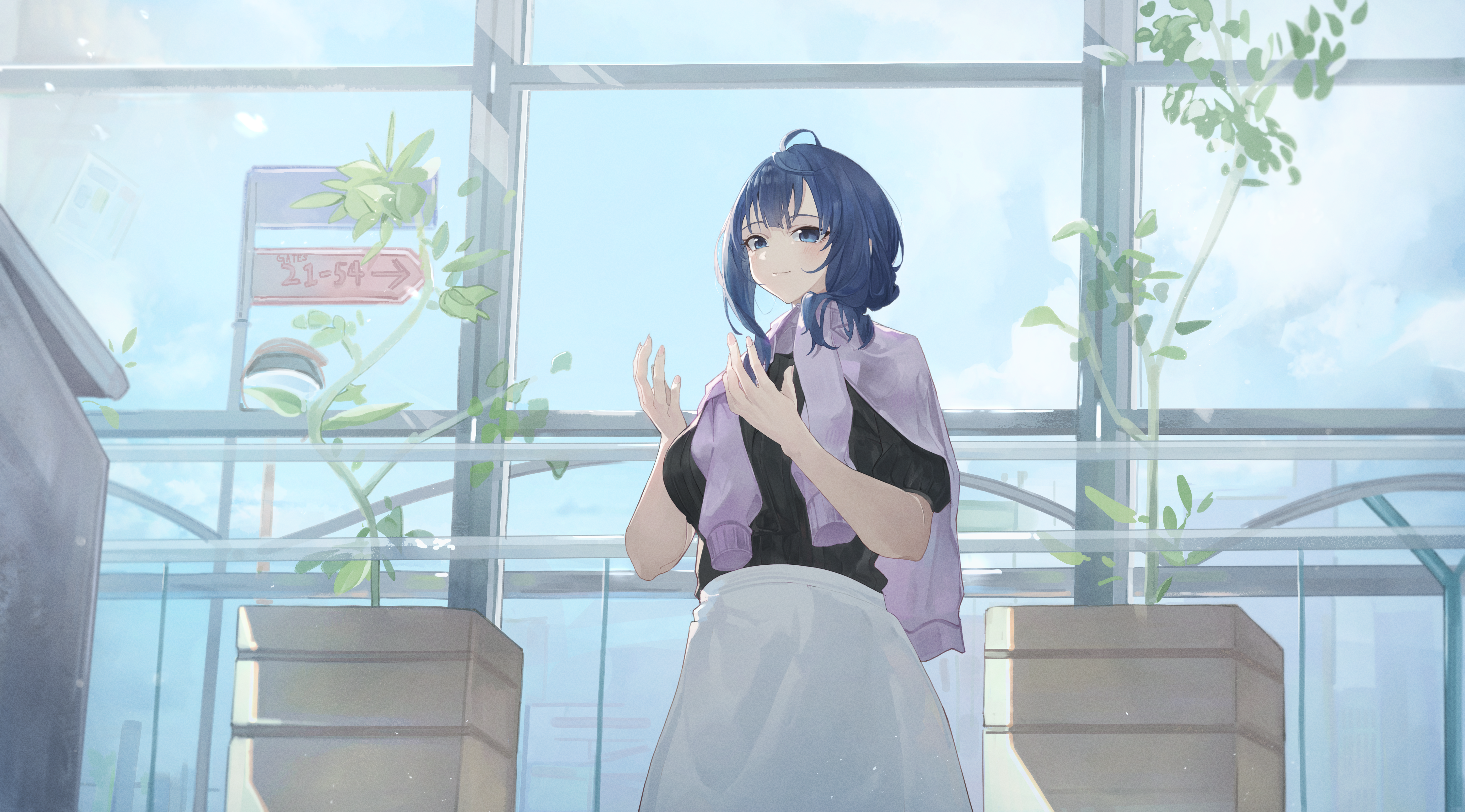 1girl absurdres ahoge blue_eyes blue_hair closed_mouth hands_up highres indoors looking_at_viewer make_heroine_ga_oo_sugiru! medium_hair megu_(jim48834420) plant potted_plant skirt solo sweater_around_neck white_skirt window yanami_anna