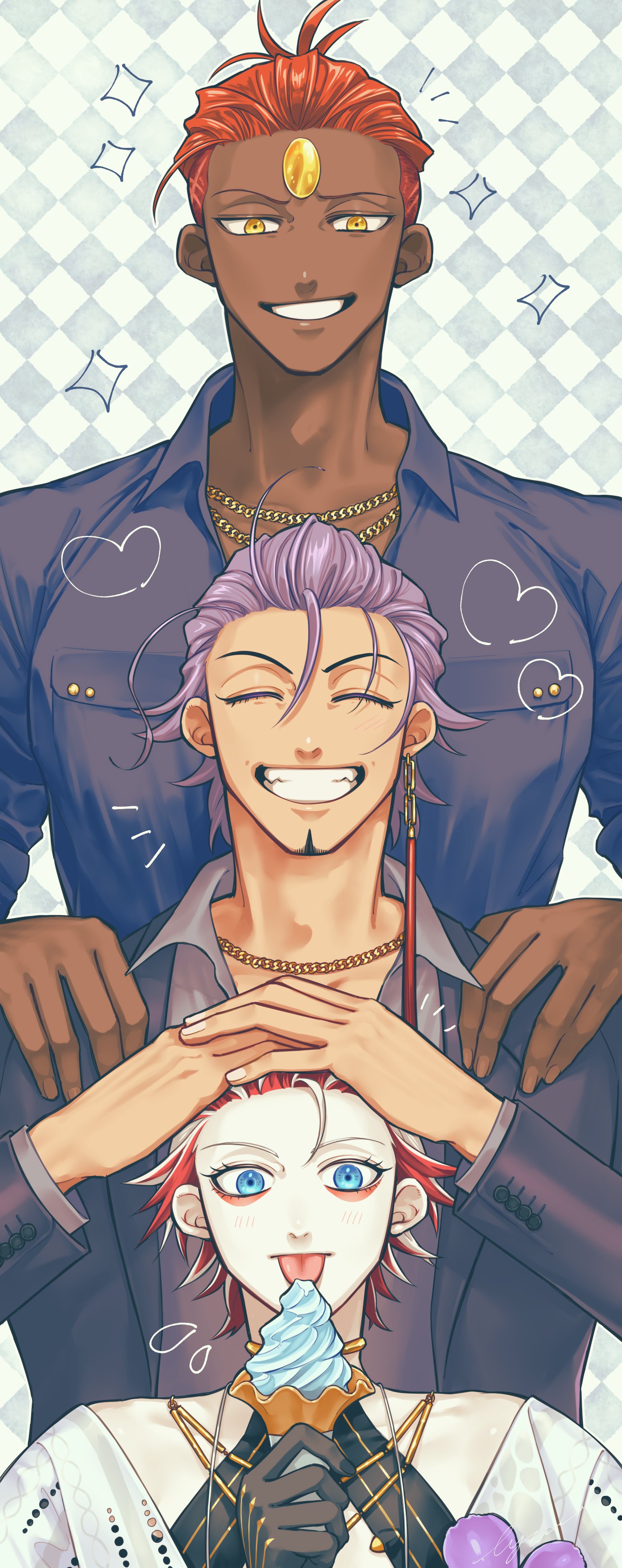 absurdres alternate_costume ashwatthama_(fate) closed_eyes duryodhana_(fate) earrings facial_hair fate/grand_order fate_(series) food forehead_jewel goatee goatee_stubble grin hand_on_another's_head heart highres ice_cream jewelry karna_(fate) karna_(summer_outfit)_(fate) large_pectorals licking long_hair lywo_n_candy male_focus official_alternate_costume pectorals purple_eyes purple_hair smile stubble thick_eyebrows upper_body
