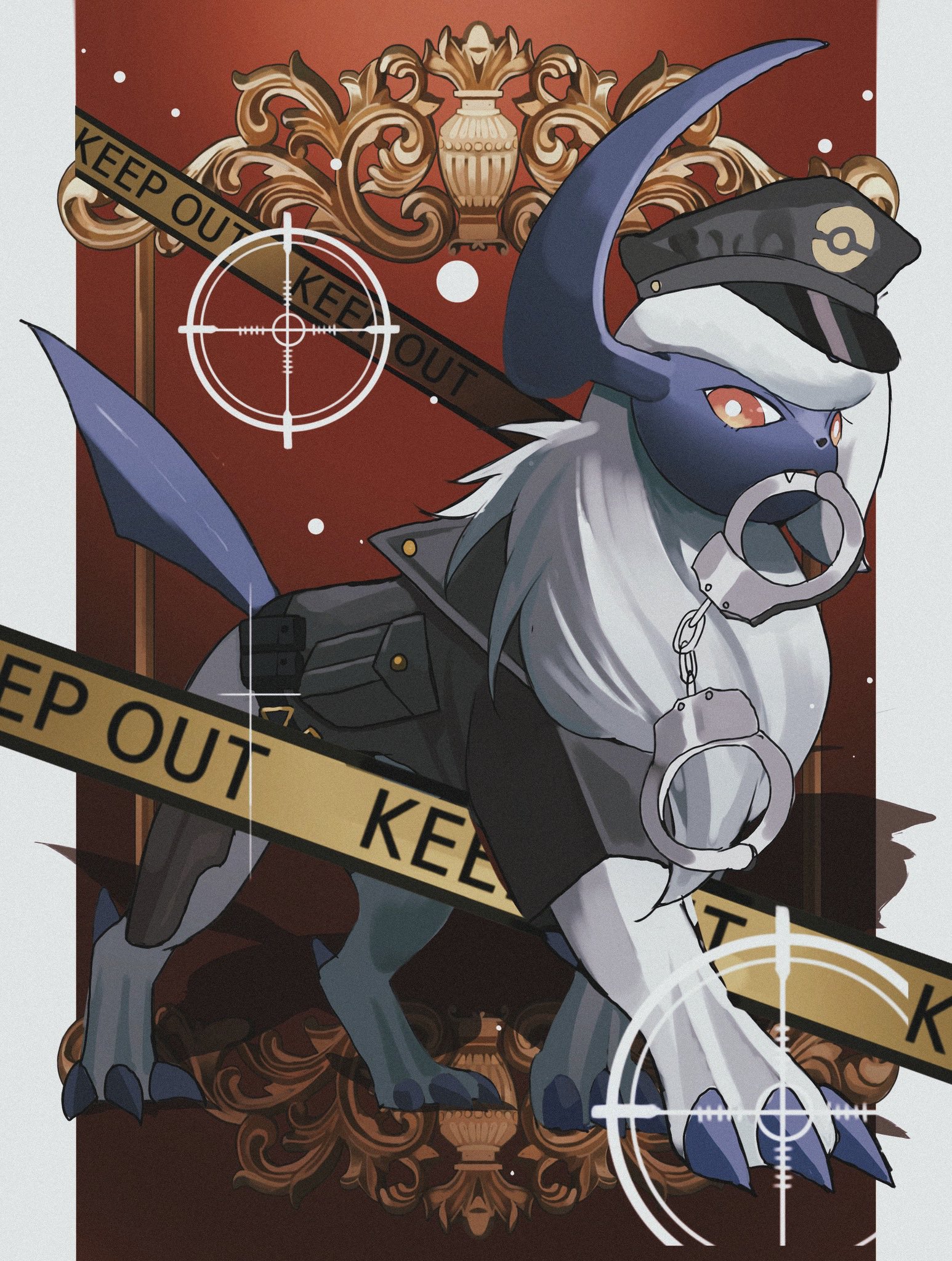 absol body_fur clothed_pokemon english_text full_body gen_3_pokemon hat highres mouth_hold nintendo pokemon pokemon_(creature) police_hat red_eyes reo_(mmocc123) solo white_fur