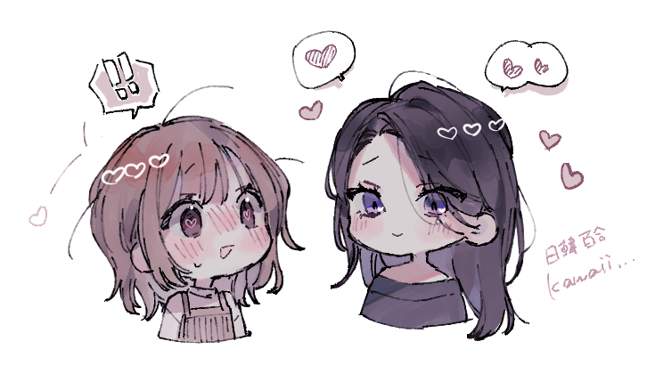 ! 2girls black_hair blush brown_hair closed_mouth commentary_request grey_shirt heart heart-shaped_pupils japan-korea_yuri_(meme) looking_at_another medium_hair multiple_girls open_mouth original purple_eyes shirt simple_background smile spoken_exclamation_mark spoken_heart sweatdrop syanimuni symbol-shaped_pupils translation_request white_background white_shirt yuri
