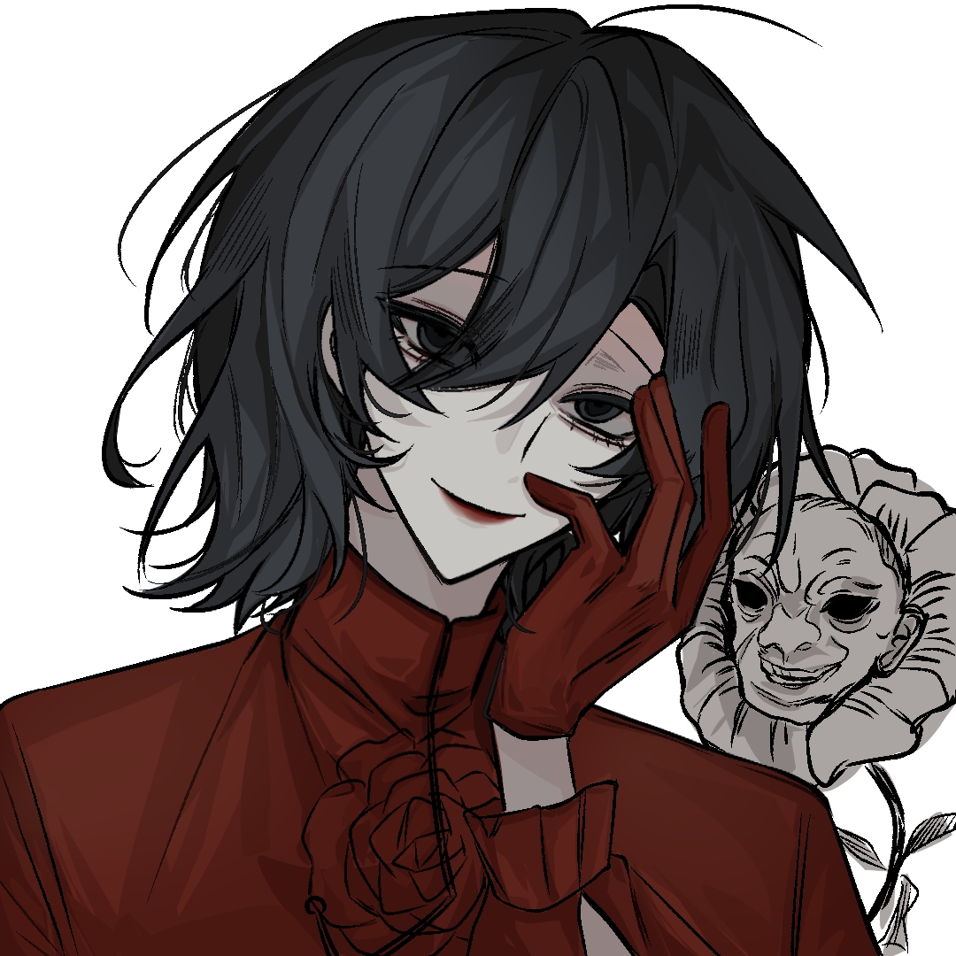 1girl aegyo_sal black_hair chinese_commentary commentary_request di_hongxia eyes_visible_through_hair frilled_sleeves frills gloves hair_between_eyes hand_on_own_cheek hand_on_own_face high_collar long_sleeves paqiang_feikuai portrait red_gloves red_lips red_shirt shirt short_hair simple_background smile solo touqi_guaitan white_background