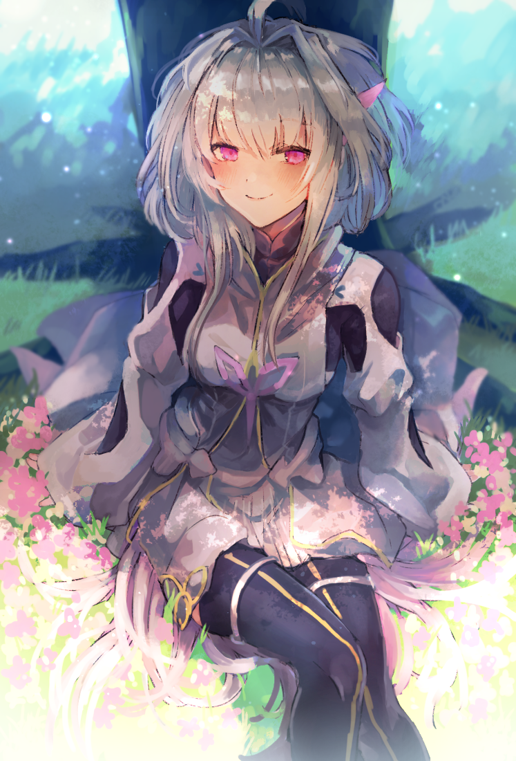 1girl against_tree ahoge black_thighhighs breasts commentary_request dappled_sunlight fate/grand_order fate/grand_order_arcade fate/prototype fate_(series) lady_avalon_(fate) long_hair long_sleeves looking_at_viewer medium_breasts merlin_(fate/prototype) nekoyamiyako on_ground outdoors purple_eyes robe shade sitting smile solo sunlight thighhighs tree tree_shade under_tree white_hair white_robe zettai_ryouiki