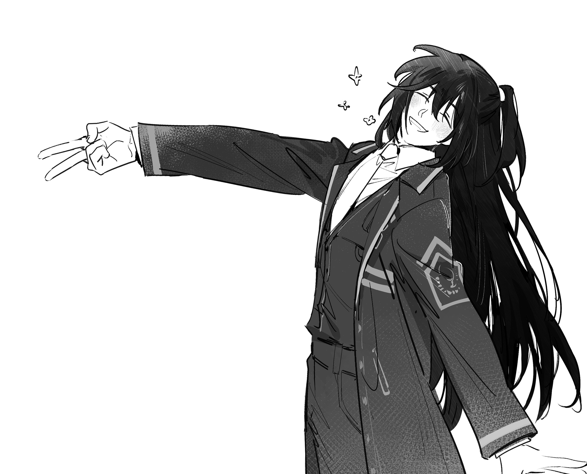 1boy arm_up blush closed_eyes coat collared_shirt greyscale grin highres hong_lu_(project_moon) limbus_company monochrome mugglesix necktie pants project_moon shirt simple_background smile solo upper_body v vest wing_collar
