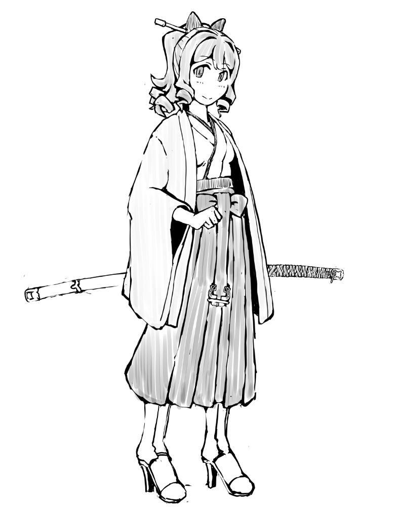 1girl anchor_ornament boots drill_hair full_body grey_eyes hakama haori hatakaze_(kancolle) high_heel_boots high_heels japanese_clothes kantai_collection katana kimono meiji_schoolgirl_uniform monochrome ponytail smile solo sword task_(s_task80) weapon