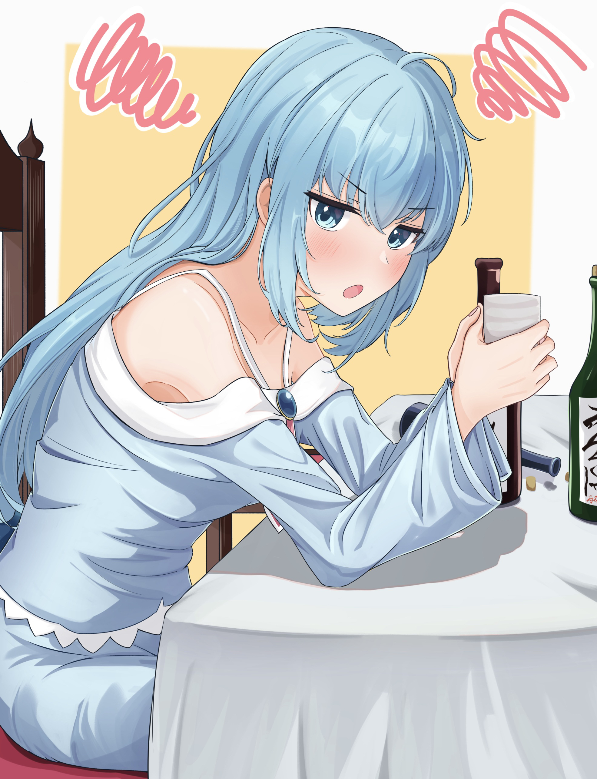 1girl absurdres ahoge aqua_(konosuba) bare_shoulders blue_eyes blue_hair blue_pajamas blue_pants blush bottle collarbone cup drinking_glass drunk elbows_on_table highres holding holding_cup kono_subarashii_sekai_ni_shukufuku_wo! long_hair long_sleeves open_mouth pajamas pants sayu_(user_yjsz2885) sitting solo table