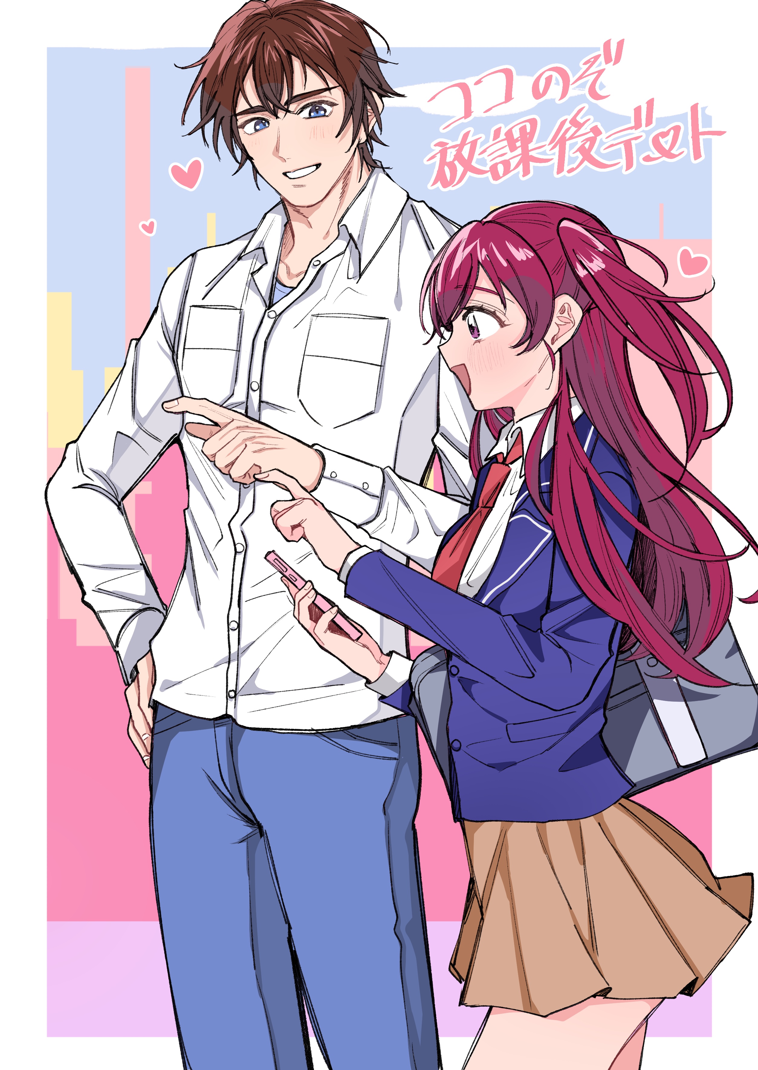 1boy 1girl absurdres bag blue_eyes blue_jacket blue_pants blue_shirt blush brown_hair brown_skirt coco_(precure) dress_shirt highres holding holding_phone jacket kibou_no_chikara_otona_precure_'23 kokoda_kouji layered_shirt long_hair necktie non_(pretty_cure620) open_mouth pants phone pink_eyes pink_hair pleated_skirt precure red_necktie school_bag school_uniform shirt short_hair skirt smile two_side_up white_shirt yes!_precure_5 yes!_precure_5_gogo! yumehara_nozomi