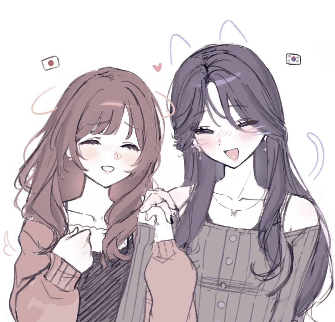 2girls ^_^ black_hair black_nails black_shirt blush brown_hair closed_eyes closed_mouth collarbone commentary_request couple drawn_ears drawn_tail drawn_whiskers earrings grey_shirt hands_up heart holding_hands interlocked_fingers jacket japan-korea_yuri_(meme) japanese_flag jewelry lia_(pzvs3887) long_hair long_sleeves meme multiple_girls nail_polish off-shoulder_shirt off_shoulder open_clothes open_jacket open_mouth original red_jacket shirt simple_background south_korea upper_body white_background yuri