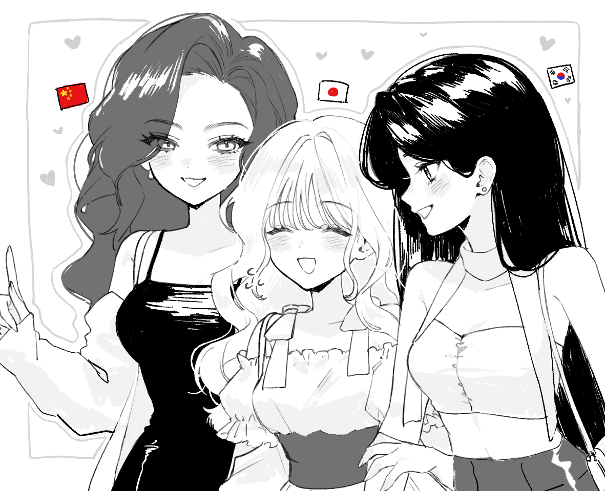 3girls bare_arms blush closed_eyes commentary_request dress earrings heart japan-korea_yuri_(meme) japanese_flag jewelry long_hair looking_at_another meme multiple_girls off-shoulder_dress off_shoulder open_mouth original people's_republic_of_china_flag potato_(potato_621) sleeveless sleeveless_dress smile south_korean_flag stud_earrings upper_body yuri