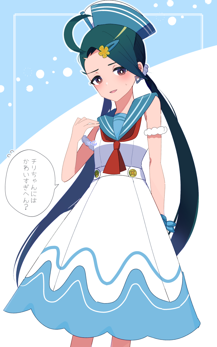 1girl acerola_(pokemon) acerola_(pokemon)_(cosplay) acerola_(summer_2024)_(pokemon) ahoge armlet blush bright_pupils brown_eyes buttons commentary_request cosplay dress earrings green_hair hair_ornament hairclip hand_up hat jewelry long_hair nintendo open_mouth pokemon pokemon_masters_ex pokemon_scarlet_and_violet rika_(pokemon) riki_(inushima_) sailor_collar sailor_dress sleeveless sleeveless_dress smile solo speech_bubble translation_request twintails white_dress white_pupils