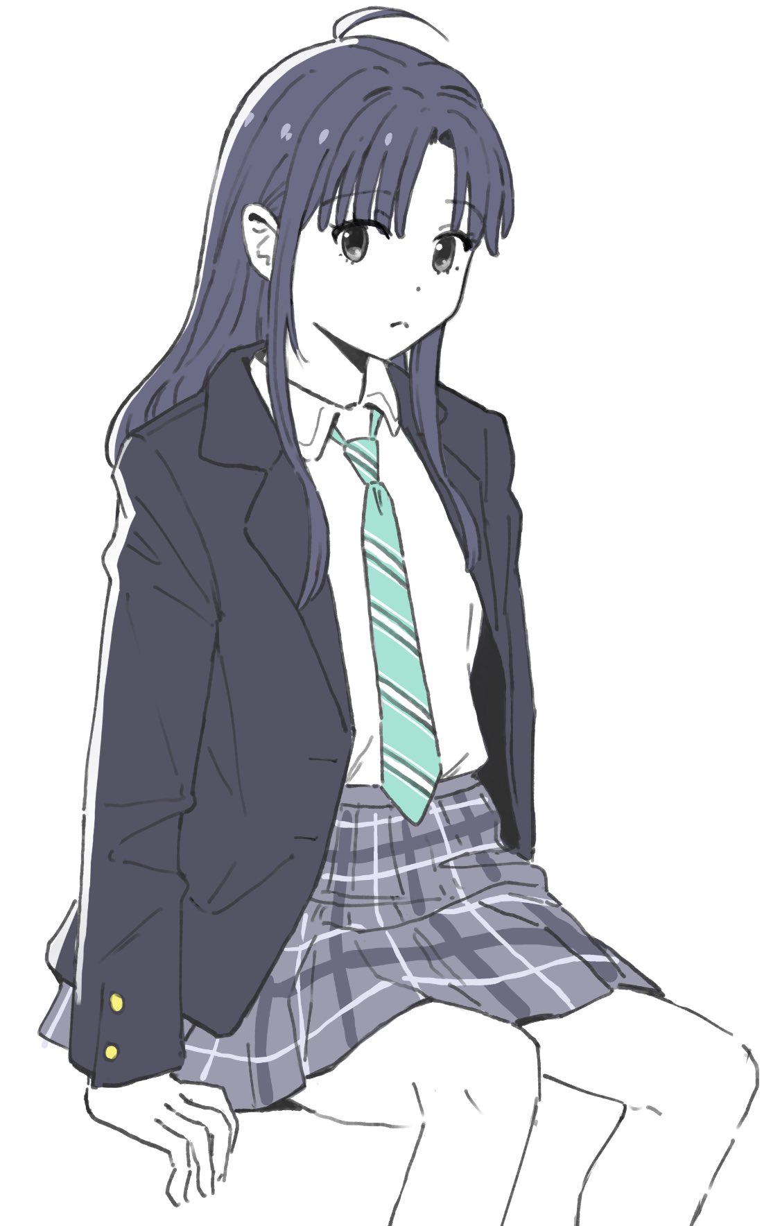 1girl ahoge aqua_necktie awa_subaru black_eyes black_hair black_jacket closed_mouth collared_shirt commentary_request detached_sleeves girls_band_cry grey_skirt highres jacket long_hair long_sleeves mole mole_under_eye necktie parted_bangs plaid_clothes plaid_skirt pleated_skirt shirt shirt_tucked_in simple_background sitting skirt soko_kikuchi solo white_background white_shirt