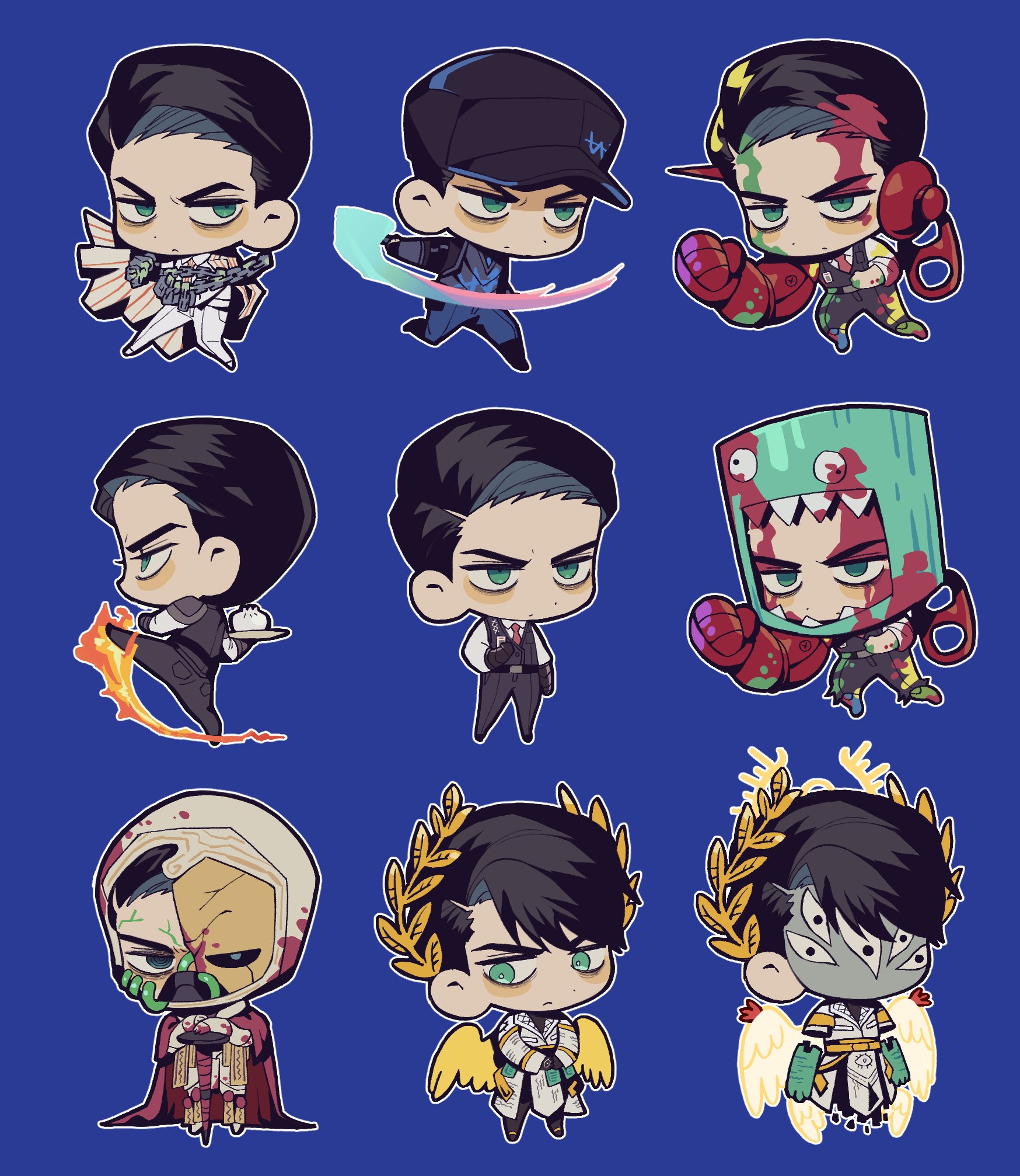 1boy angel_wings black_hair chibi closed_mouth coat collared_shirt e.g.o_(project_moon) gauntlets gloves green_eyes hair_slicked_back heavenly_executor's_scribe highres laurel_crown limbus_company limbusgudok liu_association_south_uniform long_sleeves male_focus meursault_(project_moon) n_corp._fanatic_(identity)_(project_moon) necktie pants project_moon pursuance_(e.g.o) red_necktie screwloose_wallop_(e.g.o) shirt short_hair simple_background vest w_corp._(identity)_(project_moon) white_shirt wings you_want_to_get_beat?_hurtily?