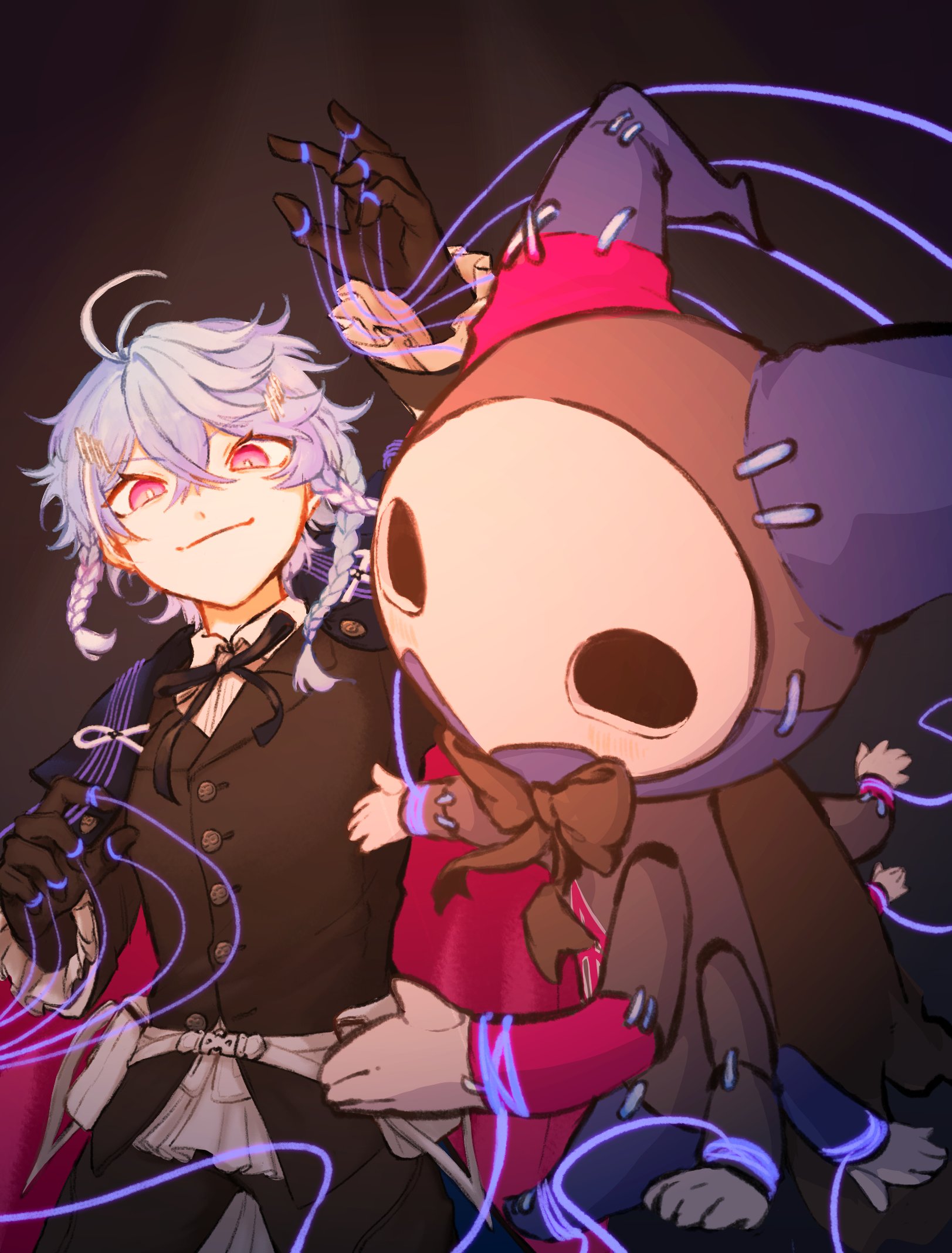 1boy antenna_hair bishounen black_bow black_bowtie black_gloves blue_hair bow bowtie braid commentary crossed_bangs dark_background english_commentary eyelashes frilled_sleeves frills gloves grey_hair hair_between_eyes hair_ornament hairpin highres holostars holostars_english jacket kemoth male_focus multicolored_hair multiple_braids multiple_hairpins octavio pink_eyes poppet_(octavio) puppet puppet_strings ribbon short_hair smile solo spotlight stitches string_around_finger tri_braids virtual_youtuber white_hair