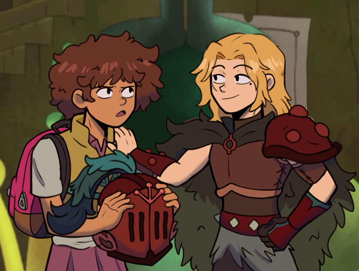2girls amphibia anne_boonchuy armor backpack bag blonde_hair blurry blurry_background bracelet breastplate brown_hair cape clenched_hand closed_mouth cowboy_shot dark-skinned_female dark_skin facial_scar fur_cape fur_skirt gloves hand_on_own_hip helmet holding holding_unworn_helmet jewelry long_hair looking_at_another mole mole_under_eye multiple_girls open_mouth osrey7 parted_bangs pleated_skirt purple_skirt sasha_waybright scar scar_on_cheek scar_on_face short_hair shoulder_armor single_glove skirt smile spiked_belt standing unworn_headwear unworn_helmet