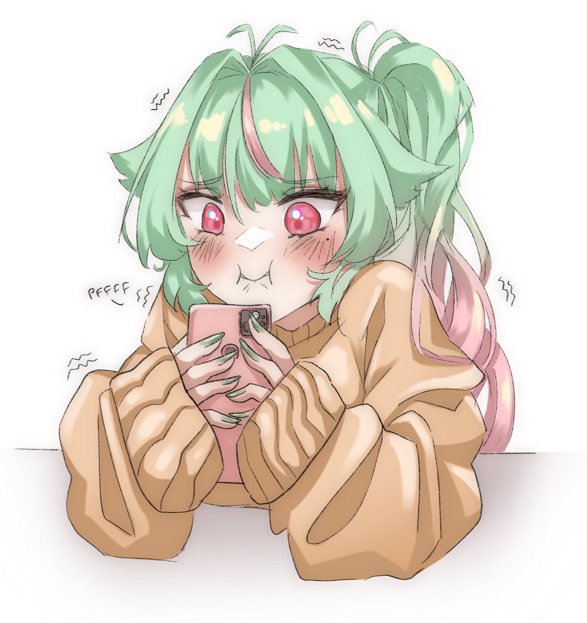 1girl antenna_hair cellphone commentary english_commentary gradient_hair green_hair hair_flaps highres holding holding_phone indie_virtual_youtuber long_sleeves melonminty melonminty_(vtuber) mole mole_under_eye multicolored_hair orange_sweater phone pink_eyes pink_hair ponytail sleeves_past_wrists smartphone solo stifled_laugh sweater trembling upper_body virtual_youtuber