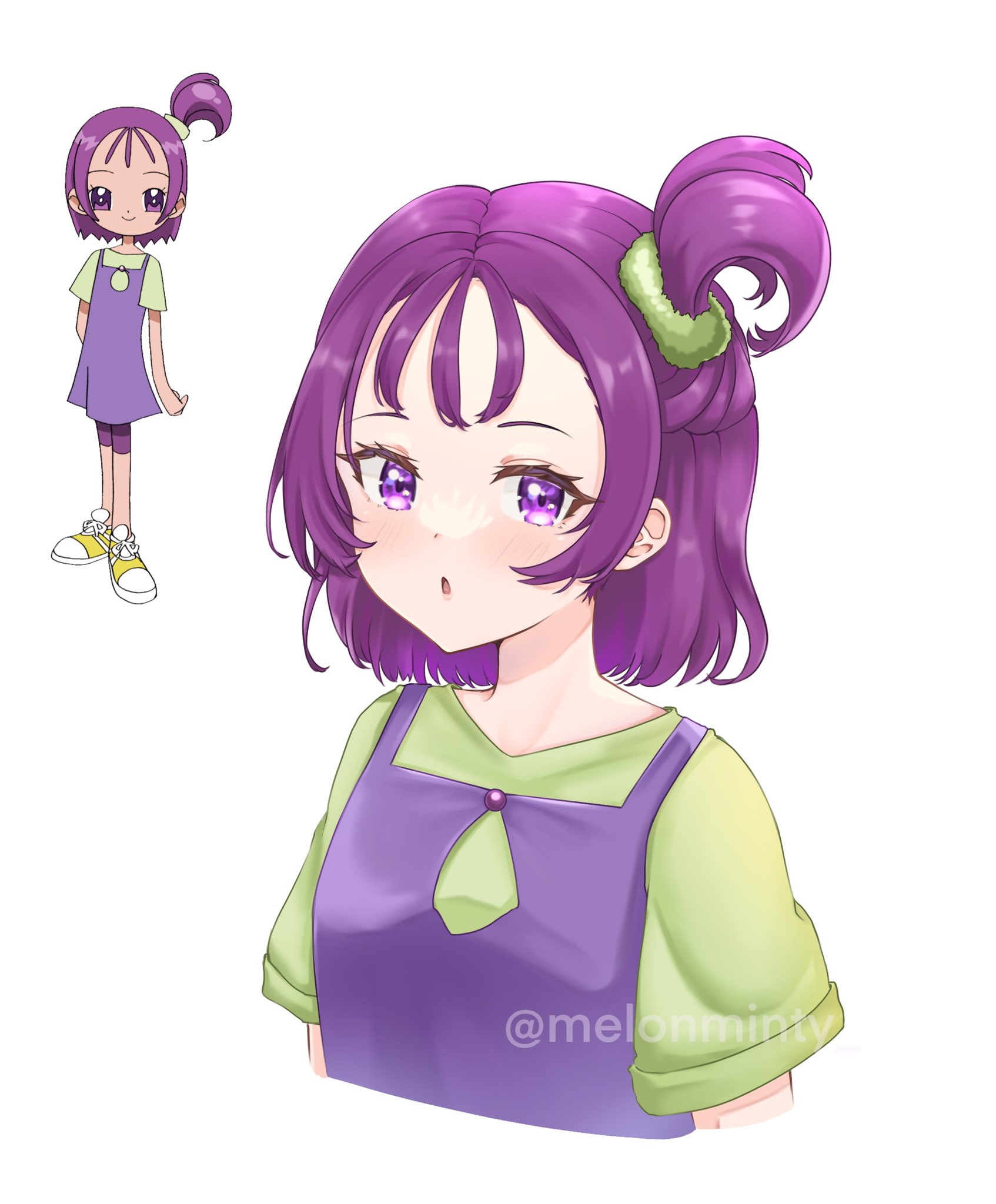1girl commentary cropped_torso dress english_commentary green_shirt hair_ornament hair_scrunchie highres making-of_available medium_hair melonminty ojamajo_doremi one_side_up purple_dress purple_eyes purple_hair reference_inset scrunchie segawa_onpu shirt solo twitter_username upper_body watermark