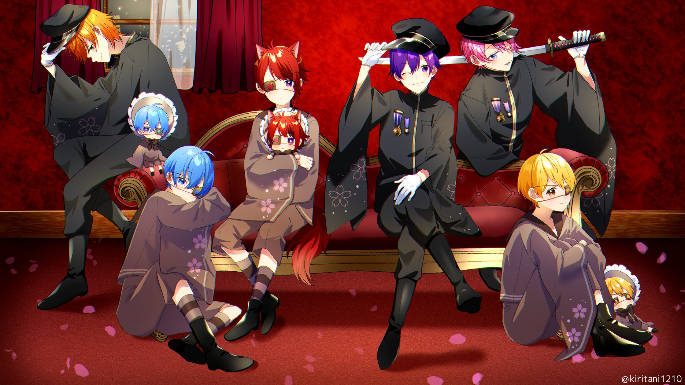 6+boys :< ;) ;d animal_ears black_footwear black_hat black_jacket black_pants blonde_hair blue_eyes blue_hair bonnet boots brown_pants brown_sailor_collar brown_shirt brown_socks capri_pants character_doll cherry_blossom_print colon_(stpri) couch crossed_legs curtains cushion dog_boy dog_ears dog_tail doll extra_ears eyepatch falling_petals floral_print full_body furisode_sleeves gloves green_eyes hair_between_eyes hand_on_headwear hat highres holding holding_sword holding_weapon hugging_doll hugging_object hugging_own_legs indoors jacket jel_(stpri) katana kiritani_(kiritani1210) knee_up knees_up long_sleeves looking_at_viewer male_focus medal multiple_boys nanamori_(stpri) night official_art on_couch on_floor one_eye_closed open_mouth orange_hair over_shoulder pants parted_lips peaked_cap petals pink_hair profile purple_eyes red_hair rinu_(stpri) root_(stpri) sailor_collar sakuramon satomi_(stpri) senbonzakura_(vocaloid) shirt short_hair sideways_glance smile socks standing strawberry_prince swept_bangs sword tail uniform utaite wallpaper_(object) weapon weapon_over_shoulder white_gloves wide_sleeves window yellow_eyes