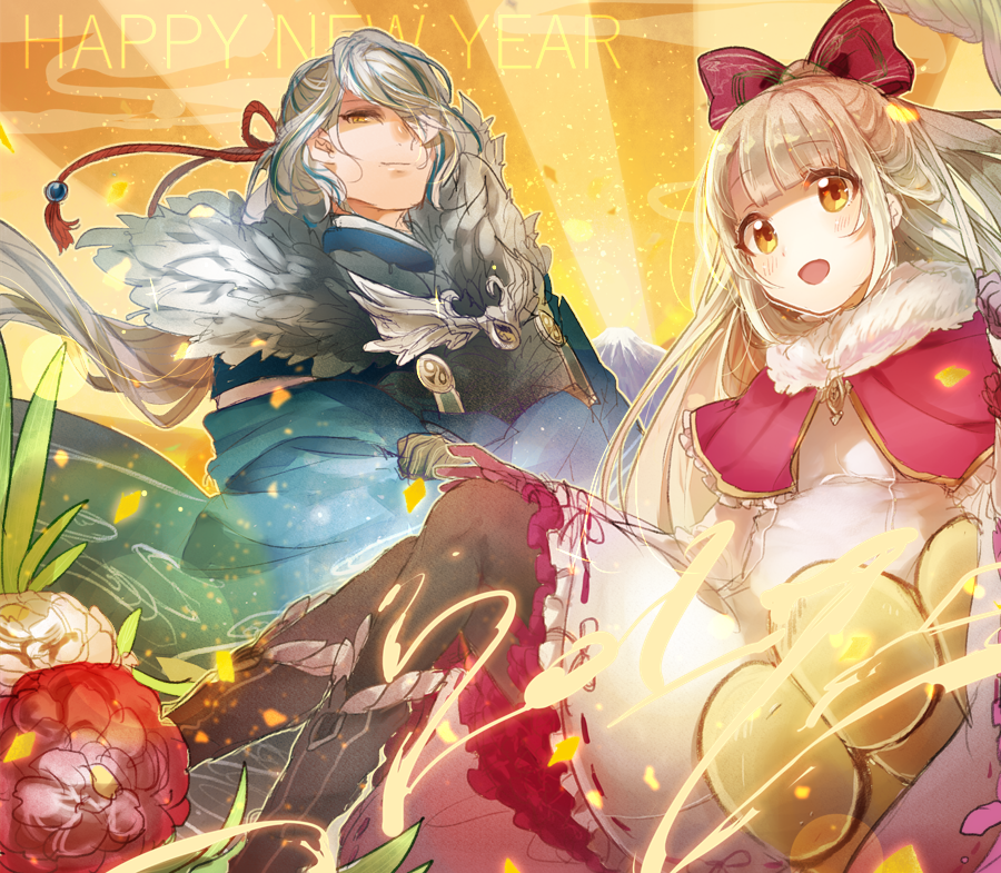 1boy 1girl :d ashley_dina black_footwear black_gloves black_pantyhose blonde_hair blue_hair blue_kimono blunt_bangs boots bow capelet closed_mouth crossed_arms dress feet_out_of_frame flower frilled_capelet frilled_dress frills fur-trimmed_capelet fur-trimmed_kimono fur_trim gloves grey_hair hair_bow hair_ornament hair_over_one_eye hair_ribbon half_gloves happy_new_year hassan_(sink916) japanese_clothes kimono leaf long_hair long_sleeves looking_at_viewer loussier_ellerensia multicolored_hair new_year open_mouth pantyhose red_bow red_capelet red_flower red_gloves red_ribbon ribbon ribbon-trimmed_dress ribbon_trim shironeko_project sitting smile streaked_hair sunburst tassel tassel_hair_ornament upper_body white_dress white_flower wide_sleeves yellow_background yellow_eyes