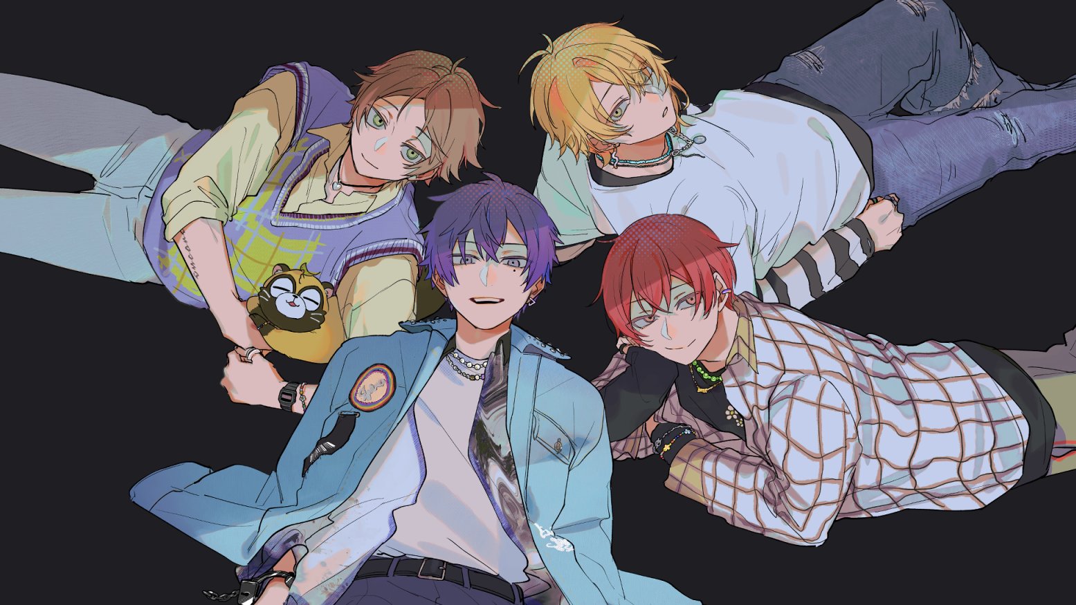 4boys aho_no_sakata argyle_clothes argyle_sweater_vest arm_out_of_sleeve arm_support bead_necklace beads belt belt_buckle black_background black_belt black_shirt blonde_hair blue_jacket bracelet brown_hair buckle circle_formation closed_mouth collared_shirt cowboy_shot crew_neck denim earrings expressionless feet_out_of_frame green_eyes hair_between_eyes hassan_(sink916) heart heart_necklace jacket jeans jewelry knee_up layered_sleeves long_sleeves looking_at_viewer lying male_focus multiple_boys necklace official_art on_back on_side on_stomach open_clothes open_collar open_jacket pants parted_bangs parted_lips plaid_clothes plaid_jacket plaid_shirt purple_eyes purple_hair purple_pants purple_sweater_vest raccoon red_eyes red_hair senra_(utaite) shima_(utaite) shirt short_hair short_over_long_sleeves short_sleeves simple_background single_earring sleeves_rolled_up smile striped_clothes striped_shirt sweater_vest thumb_ring torn_clothes torn_jeans torn_pants triangle_earrings urashimasakatasen uratanuki utaite watch white_jacket white_pants white_shirt wristwatch yamadanuki yellow_eyes yellow_pants yellow_shirt