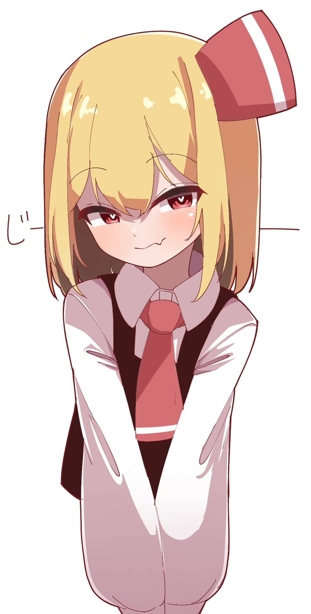 1girl ascot black_vest blonde_hair blush collared_shirt fang hair_ribbon heart heart-shaped_pupils highres long_sleeves looking_at_viewer open_mouth oyatu_potage red_ascot red_eyes red_ribbon ribbon rumia shirt short_hair simple_background skin_fang solo symbol-shaped_pupils touhou upper_body vest white_background white_shirt