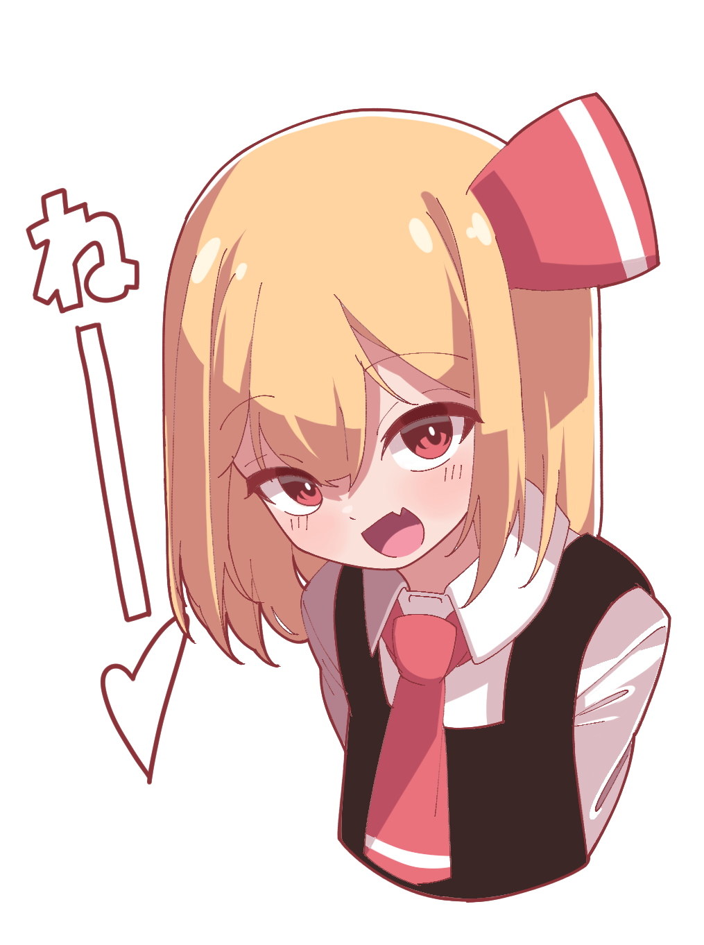 1girl ascot black_vest blonde_hair blush collared_shirt fang hair_ribbon highres long_sleeves looking_at_viewer open_mouth oyatu_potage red_ascot red_eyes red_ribbon ribbon rumia shirt short_hair simple_background skin_fang solo touhou upper_body vest white_background white_shirt