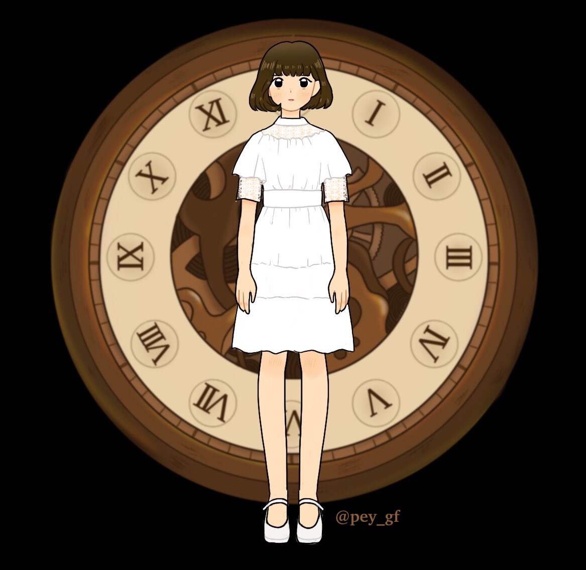 1girl animification black_background blunt_bangs brown_hair clock commentary dress eunha_(gfriend) expressionless full_body gfriend k-pop looking_at_viewer pey_gf real_life short_hair short_sleeves solo twitter_username white_dress white_footwear