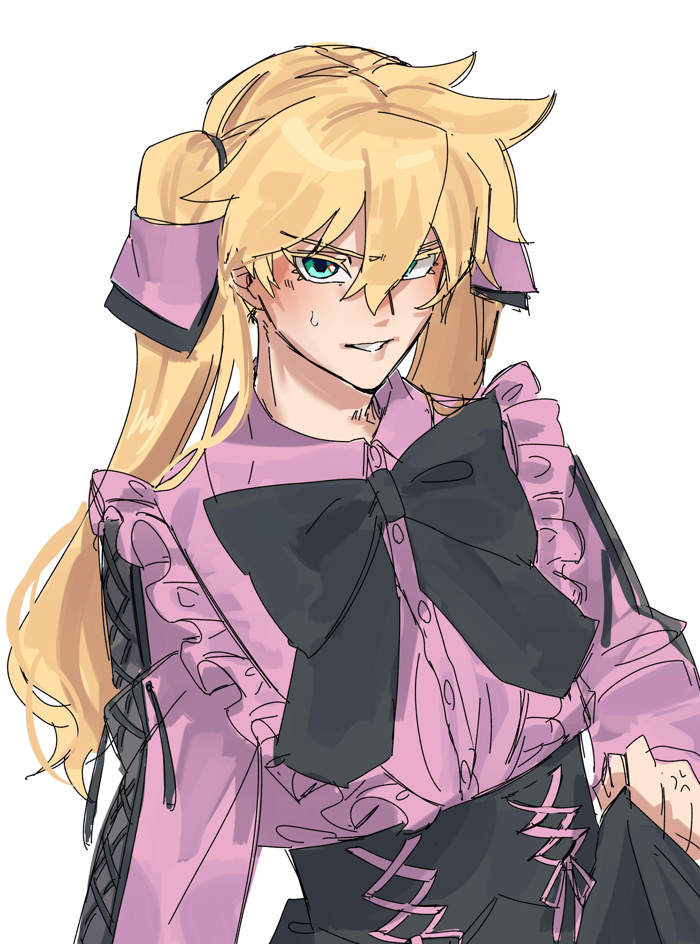 1boy absurdres androgynous black_bow black_skirt blonde_hair blue_eyes blush bow chinese_text clothing_request crossdressing crossdressing_(mtf) dress flustered green_eyes guilty_gear hair_ornament hair_over_one_eye highres ky_kiske long_hair looking_at_viewer male_focus nekoha0901 simplified_chinese_text skirt solo sweatdrop trap twintails white_background