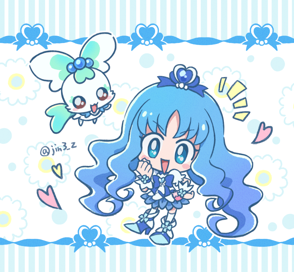 1girl 1other blue_eyes blue_hair blue_skirt blush_stickers chibi clenched_hand coffret_(precure) commentary_request cuffs cure_marine hand_on_own_hip handcuffs heart heartcatch_precure! jin_(jin3jin3) kurumi_erika long_hair looking_at_viewer notice_lines precure puffy_short_sleeves puffy_sleeves short_sleeves skirt smile twitter_username