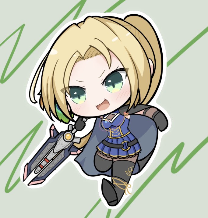 1girl :d assault_lily belt black_belt black_boots black_cape black_gloves black_thighhighs blonde_hair blue_skirt blue_sky blush boots brown_pantyhose cape chibi commentary elbow_gloves feather_hair_ornament feathers floral_print full_body gloves green_background green_eyes green_feathers hair_ornament hands_up happa_no_tanupon high_ponytail holding holding_sword holding_weapon leg_up long_hair looking_ahead maruyama_amane miniskirt o-ring o-ring_belt odaiba_girls_high_school_uniform open_mouth outline pantyhose parted_bangs pleated_skirt ponytail print_thighhighs running school_uniform shirt skirt sky sleeveless sleeveless_shirt smile solo striped_background sword thighhighs thighhighs_over_pantyhose v-shaped_eyebrows weapon white_outline